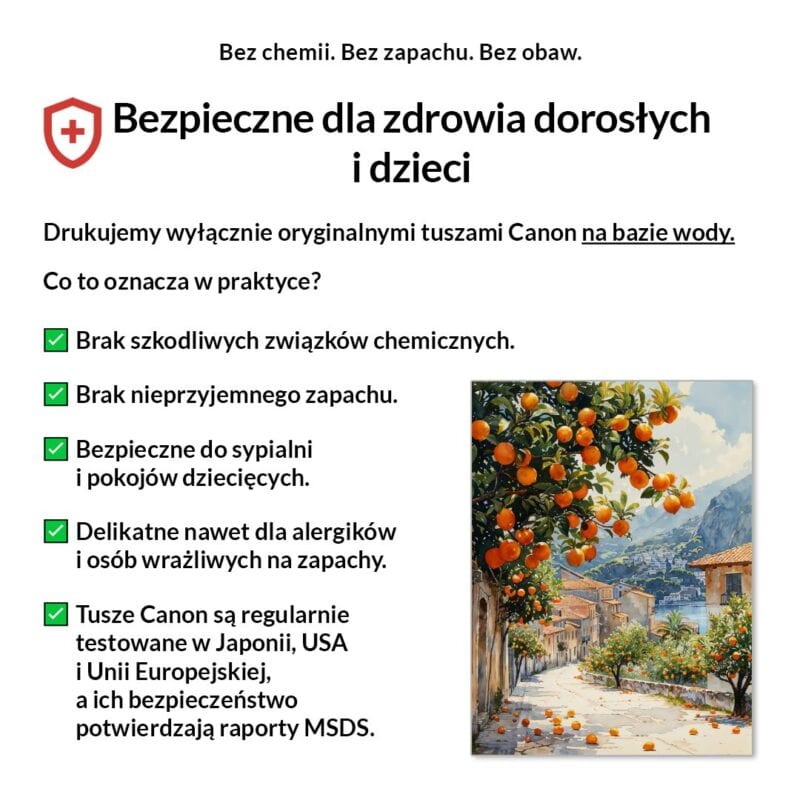 Tak, absolutnie! Drukujemy wyłącznie certyfikowanymi, bezwonnymi tuszami pigmentowymi Canon Lucia Pro na bazie wody. Są one w pełni bezpieczne dla zdrowia, nie zawierają rozpuszczalników i mogą być bez obaw stosowane w sypialniach i pokojach dziecięcych.