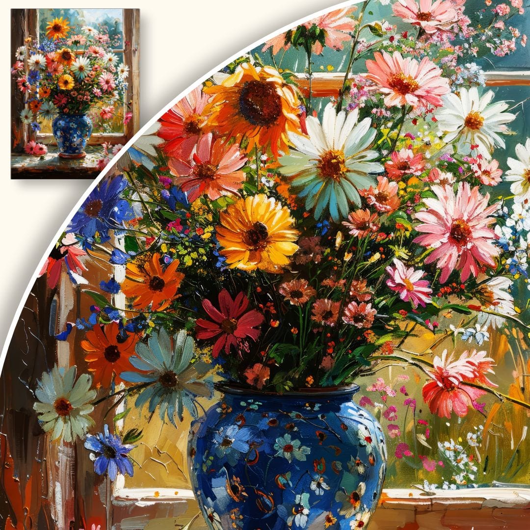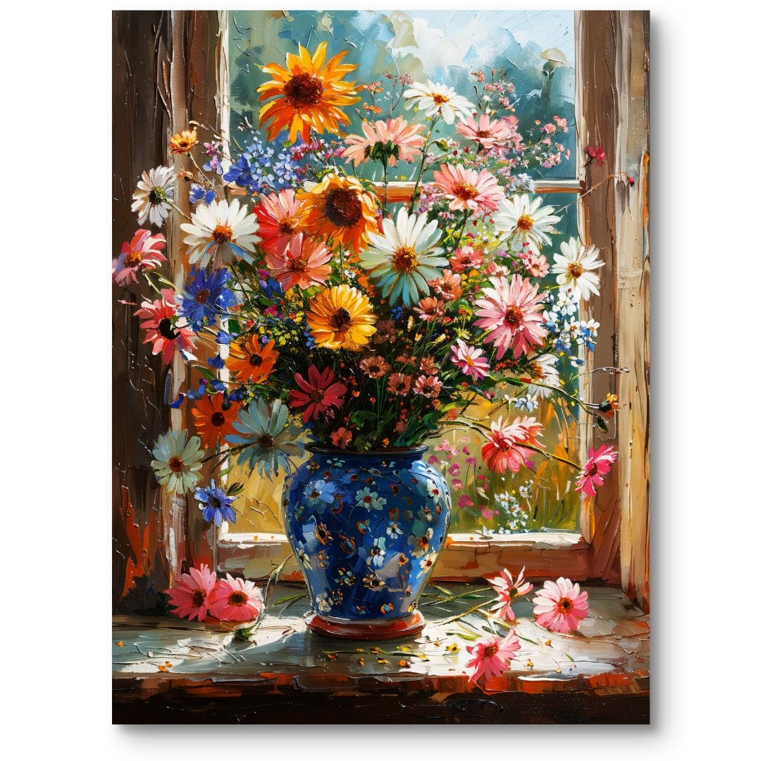 Obraz na płótnie ukazuje malowniczy, barwny bukiet kwiatów w wazonie, ustawionym na parapecie przy oknie. Kompozycja urzeka bogactwem kwiatów, wśród których prym wiodą odcienie pomarańczowego, bieli i zieleni. Przez subtelnie ułożone płatki przebijają się ciepłe promienie słońca, podkreślając energię oraz naturalne piękno tej kwiatowej sceny.