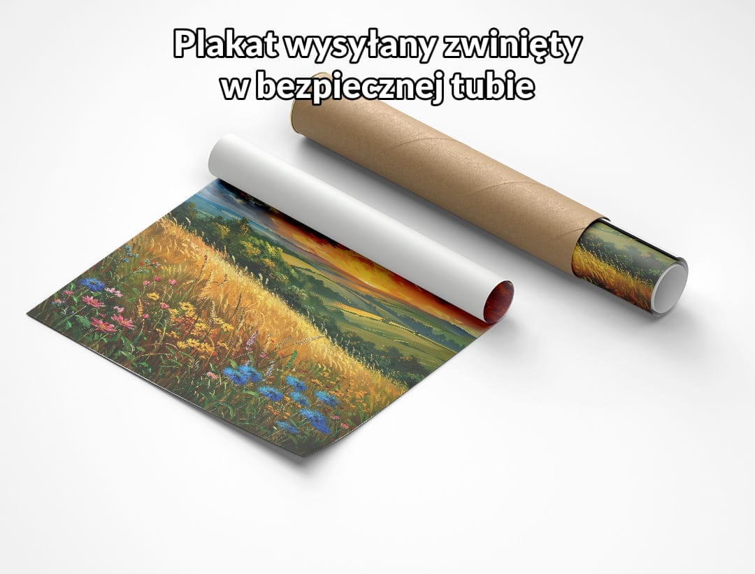 Obraz przyciąga wzrok wyjątkowym kontrastem między jasnymi kwiatami i zbożem a ciepłymi, nastrojowymi odcieniami nieba. Zachodzące słońce otula krajobraz złotą poświatą, nadając mu subtelnego realizmu i głębi. Żywe, nasycone barwy sprawiają, że płótno staje się wyrazistym, dekoracyjnym akcentem w każdym wnętrzu.