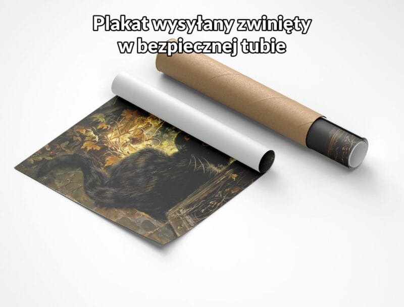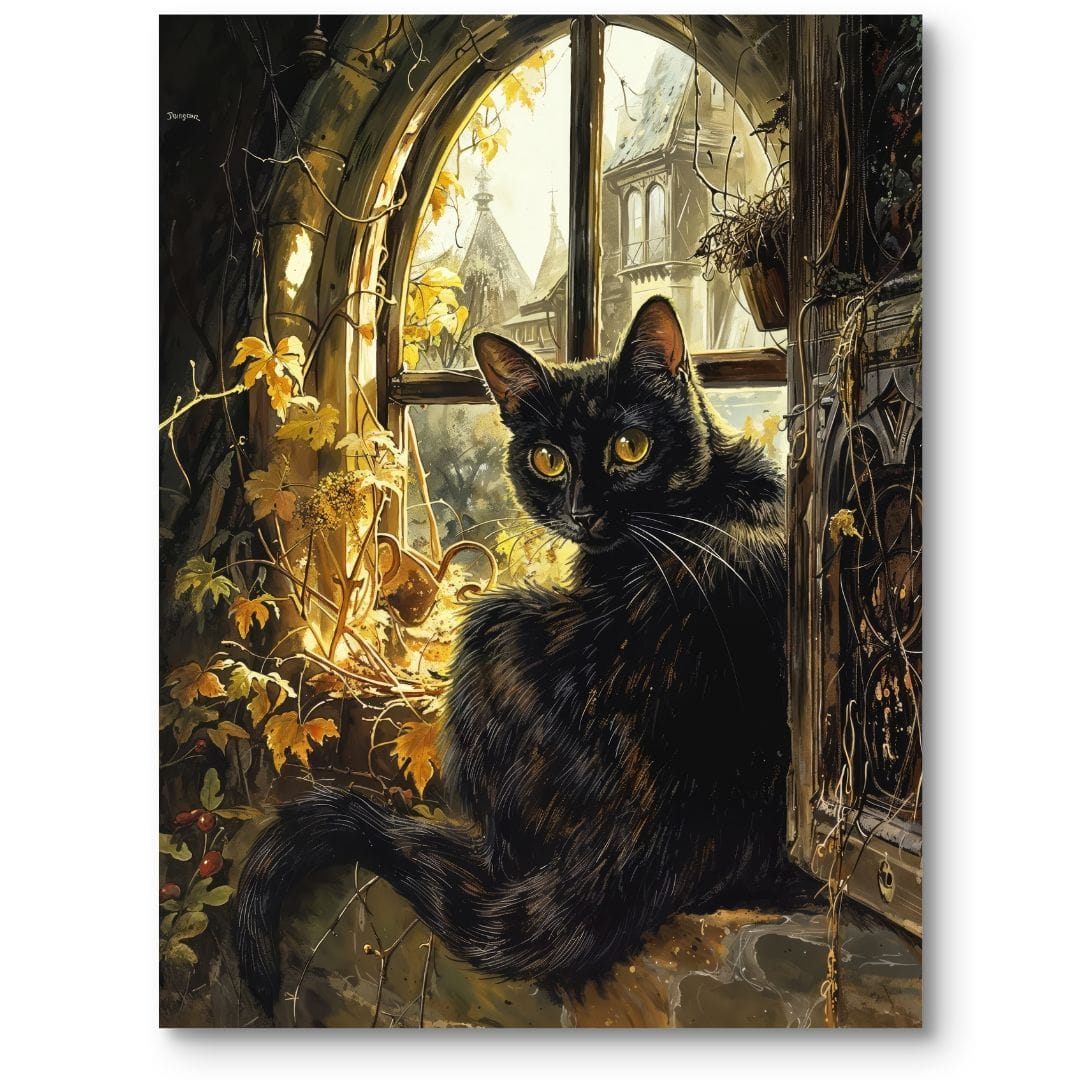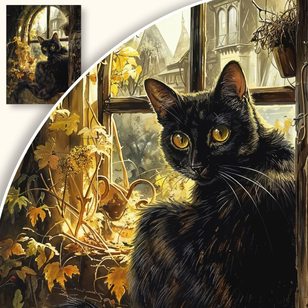 Kompozycja obrazu przyciąga wzrok na sylwetkę kota, której aksamitna czerń doskonale kontrastuje z blaskiem jesiennych liści oraz delikatnym światłem wlewanym przez okno. Subtelnie oddane detale architektoniczne w tle nadają scenie klimatycznej głębi i niepowtarzalnej atmosfery.