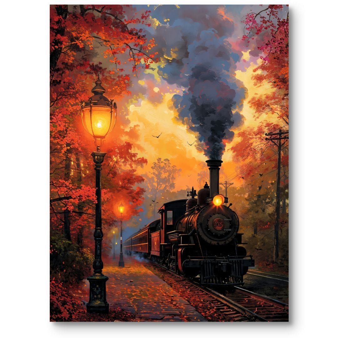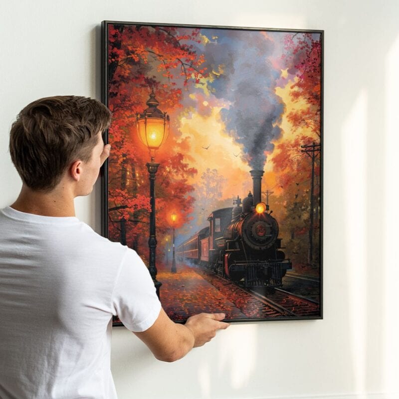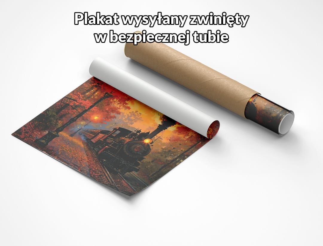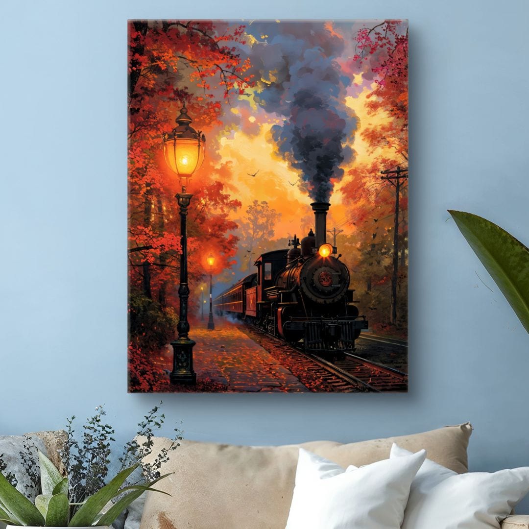 Obraz na płótnie ukazuje majestatyczny parowy pociąg mknący przez malowniczy, jesienny las. Scena rozświetlona ciepłym światłem latarni emanuje nostalgią i romantyzmem, tworząc wyjątkową atmosferę pełną czułości dla minionych epok. W tle rozgościły się drzewa przystrojone w liście w odcieniach czerwieni, pomarańczu i złota, co podkreśla magiczny klimat schyłku jesieni.