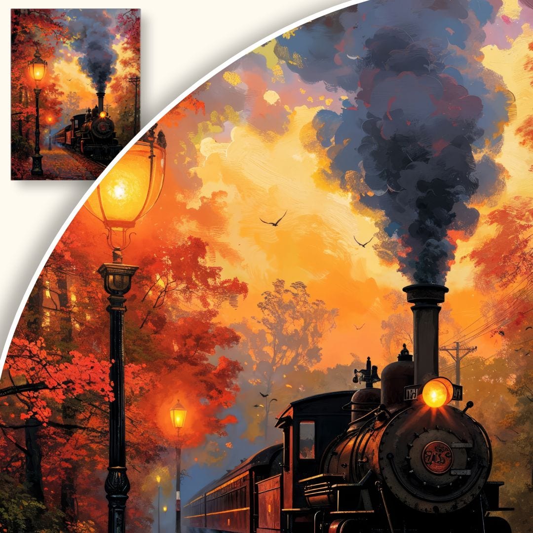 Pociąg, stanowiący punkt centralny kompozycji, doskonale komponuje się z harmonią barw dominujących w obrazie. Ciepłe tony czerwieni, pomarańczu i złota w połączeniu z refleksami latarni ożywiają scenę, nadając jej dynamiczny, niemal przestrzenny charakter.