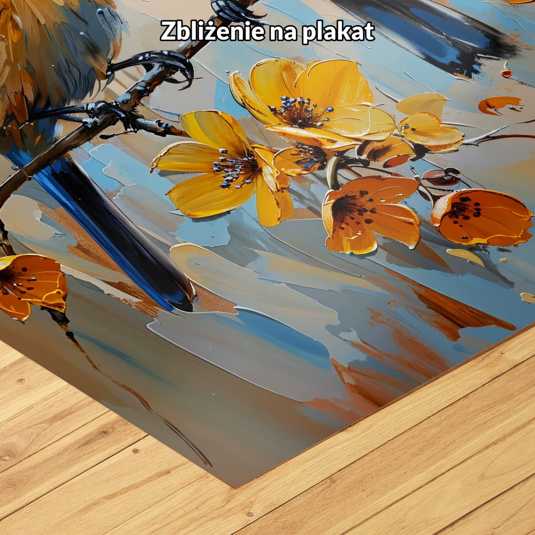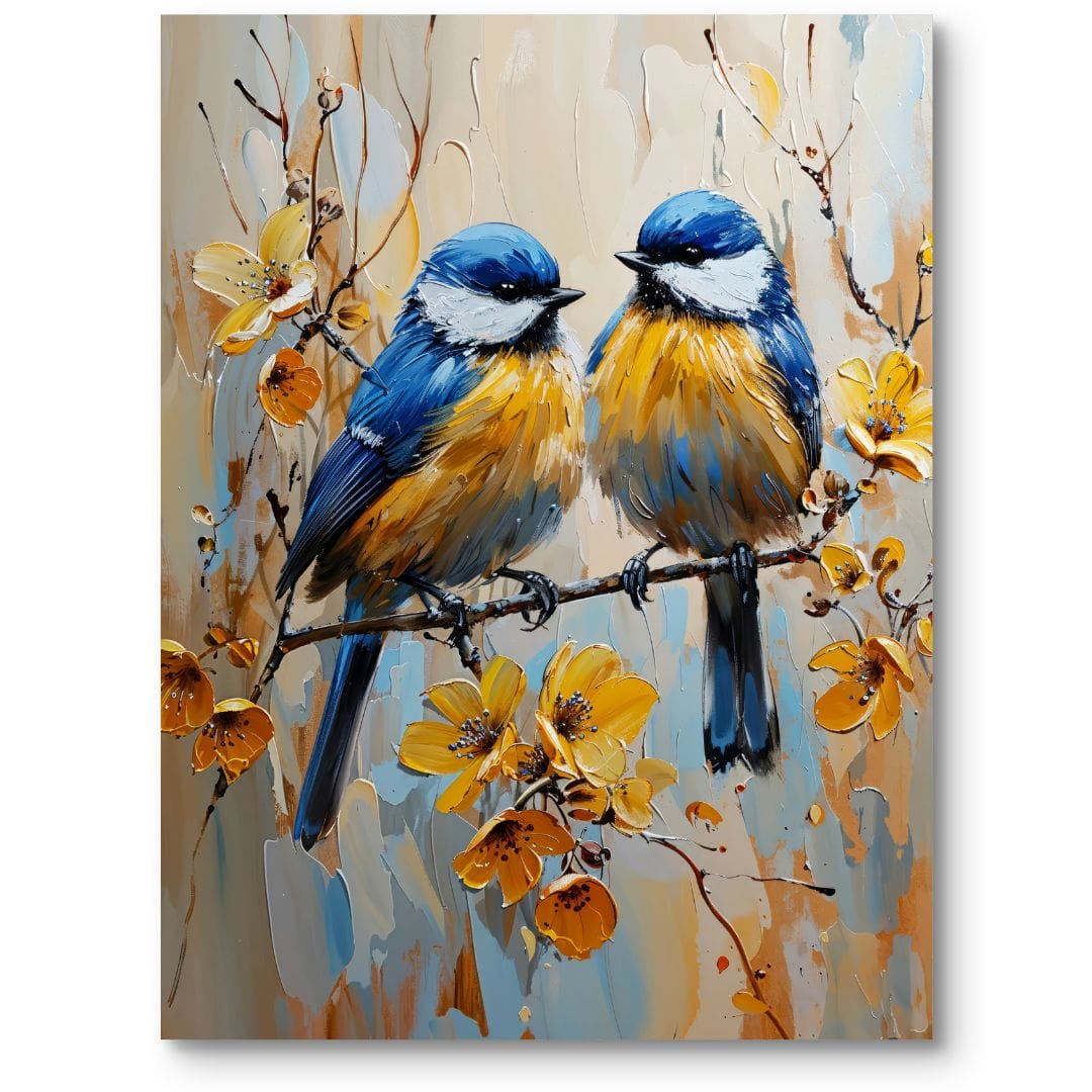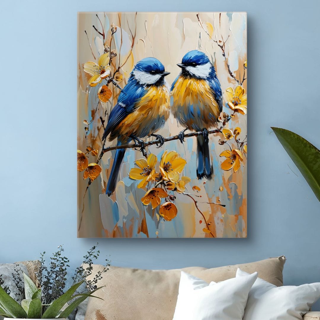 Obraz na płótnie ukazuje parę wdzięcznych ptaków, siedzących na gałęzi pośród rozkwitających kwiatów. Artystyczne użycie jasnych, żywych barw nadaje kompozycji radosny, optymistyczny charakter. Dzięki temu obraz wnosi do wnętrza nie tylko ożywcze kolory, ale i niezwykłe ciepło. Szczegółowe oddanie postaci ptaków zachwyca realizmem i precyzją, wprowadzając do przestrzeni element natury uchwycony w pięknym, pozytywnym momencie.