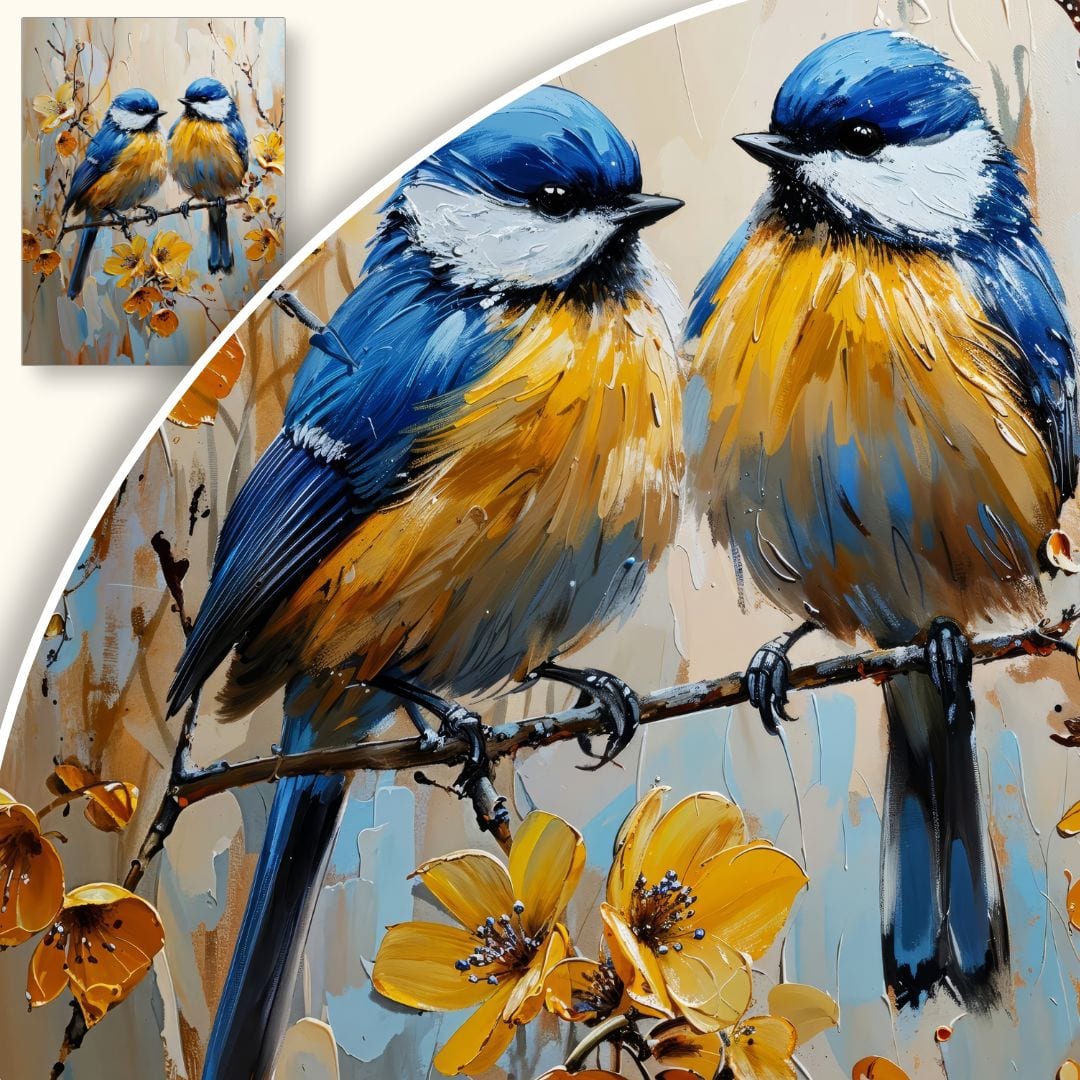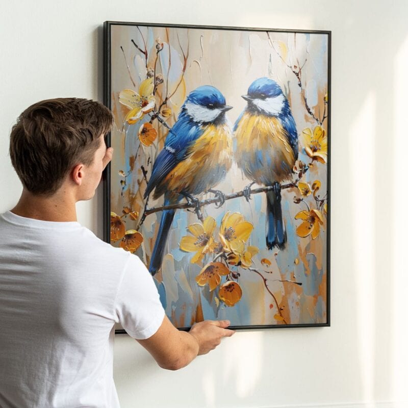 Kompozycja jest harmonijnie wyważona – ptaki umieszczone centralnie przyciągają wzrok, a subtelnie rozproszone światło podkreśla miękkość detali. Połączenie odcieni niebieskiego, żółtego i bieli tworzy efekt świeżości i lekkości, która wzbogaca każde wnętrze.