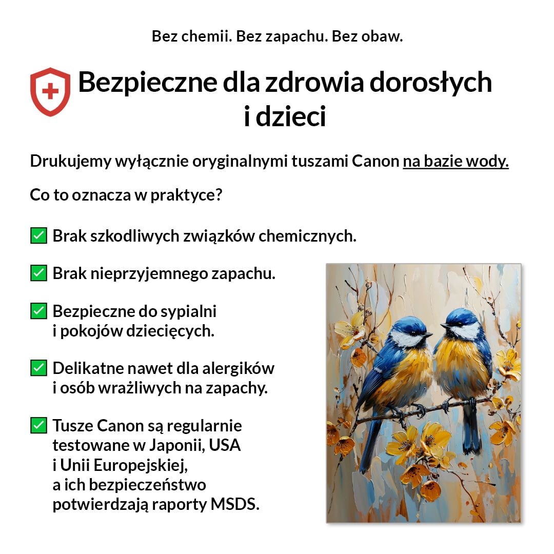 Tak, absolutnie! Drukujemy wyłącznie certyfikowanymi, bezwonnymi tuszami pigmentowymi Canon Lucia Pro na bazie wody. Są one w pełni bezpieczne dla zdrowia, nie zawierają rozpuszczalników i mogą być bez obaw stosowane w sypialniach i pokojach dziecięcych.