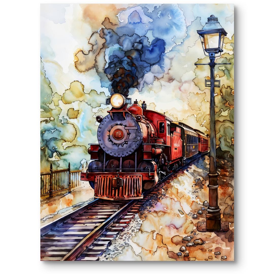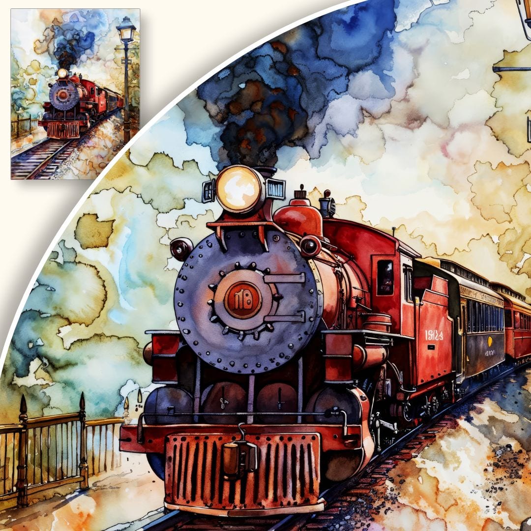 Dzieło powstało w technice akwareli, dzięki której obraz uzyskał charakterystyczną lekkość i transparentność. Realistyczny sposób ukazania parowozu przeplata się z delikatnie zaznaczoną nostalgią, oddając ducha stylu vintage. Akwarela, uznawana za jedną z najbardziej szlachetnych technik malarskich, pozwala uzyskać subtelne cieniowanie oraz ekspresję światła, dzięki którym każda scena wydaje się żywa i pełna emocji.
