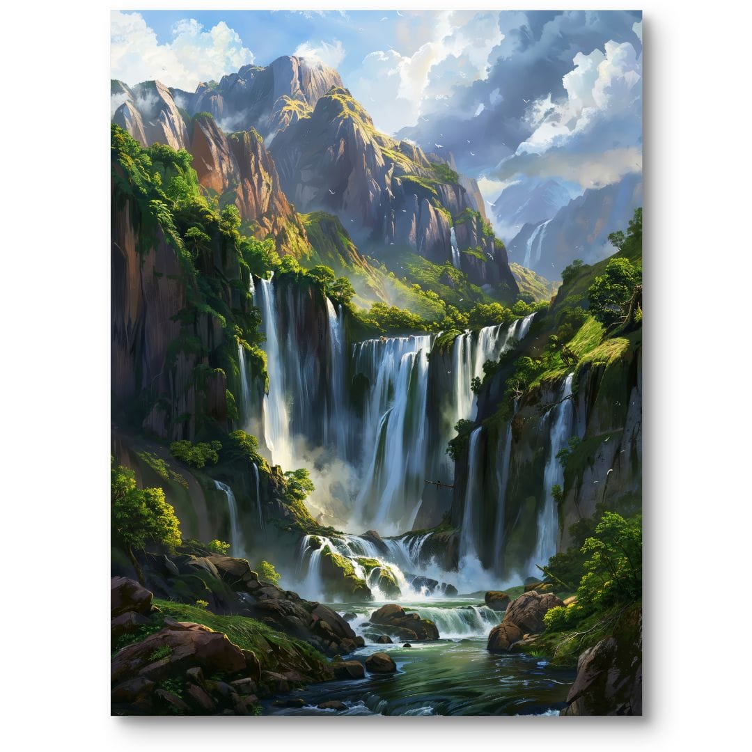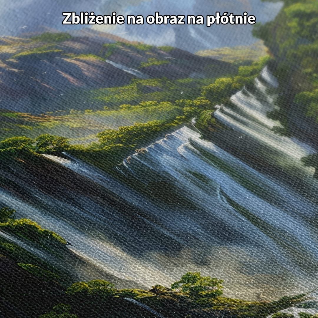 Obraz na płótnie prezentuje malowniczy, majestatyczny krajobraz, w którym monumentalne góry stanowią tło dla licznych, kaskadowych wodospadów. Otacza je bujny, zielony las rozświetlony ciepłymi promieniami słońca, tworząc kompozycję oddającą prawdziwą esencję dziewiczej przyrody. Ta harmonijna sceneria przenosi widza w świat nieskażonego piękna natury.