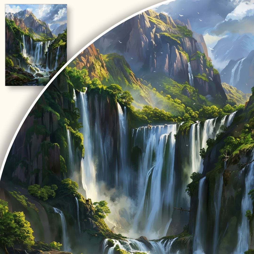 - Motyw górskiego pejzażu z wodospadami i lasem