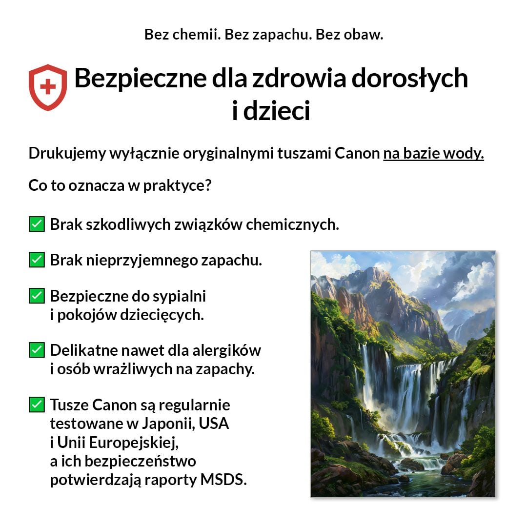 Tak, absolutnie! Drukujemy wyłącznie certyfikowanymi, bezwonnymi tuszami pigmentowymi Canon Lucia Pro na bazie wody. Są one w pełni bezpieczne dla zdrowia, nie zawierają rozpuszczalników i mogą być bez obaw stosowane w sypialniach i pokojach dziecięcych.