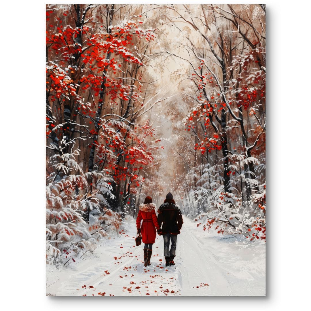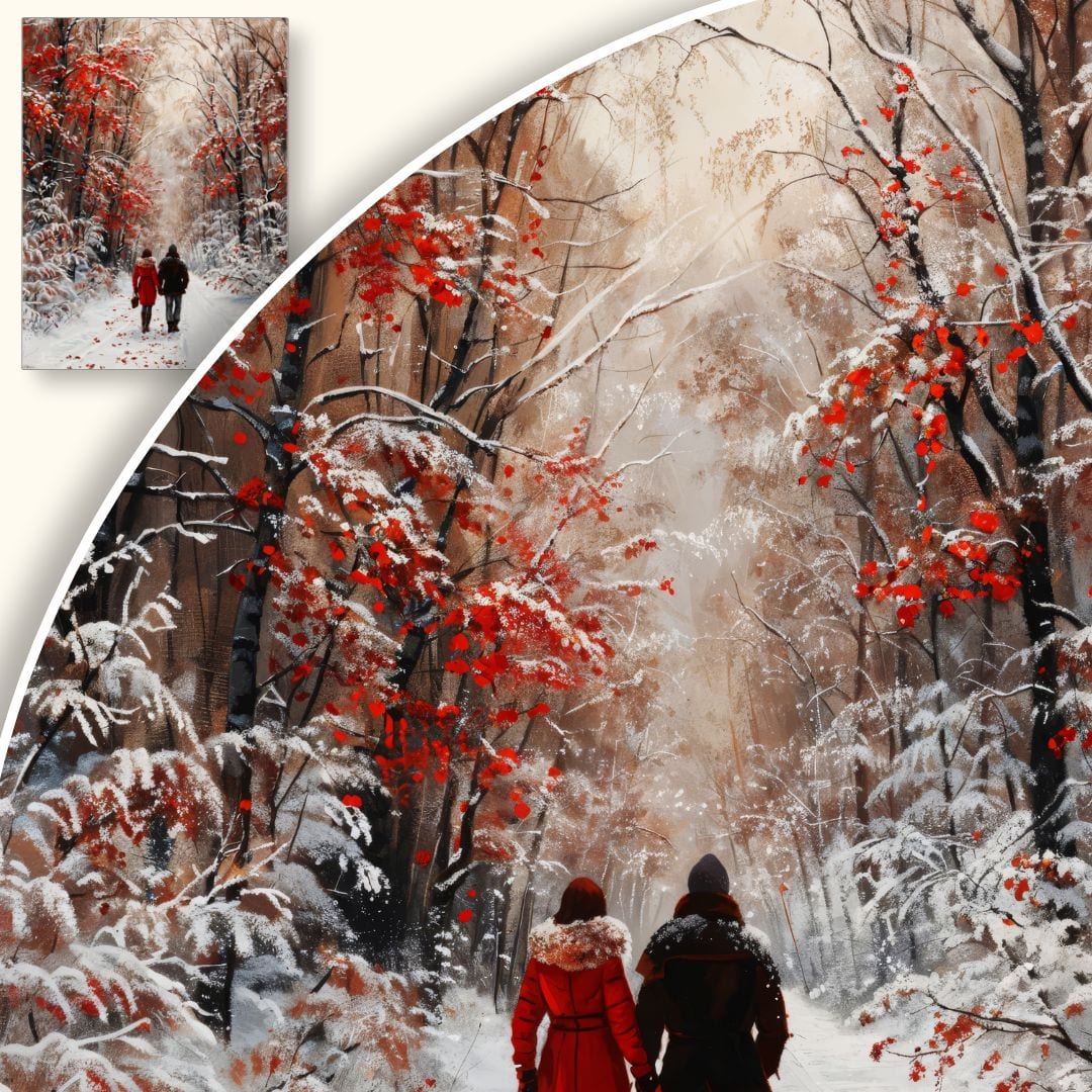 Prezentowany obraz ukazuje magiczny zimowy pejzaż z parą zakochanych, trzymających się za ręce podczas spaceru wśród zaśnieżonych drzew z czerwonymi liśćmi. Kompozycja emanuje urokiem zimy oraz ciepłem wzajemnych relacji, przenosząc odbiorcę w świat pełen nostalgii, spokoju i emocji. To dzieło nie tylko zachwyca estetyką, ale i przywołuje wspomnienia oraz uczucia związane z miłością, bliskością i wspólnym przeżywaniem wyjątkowych chwil.