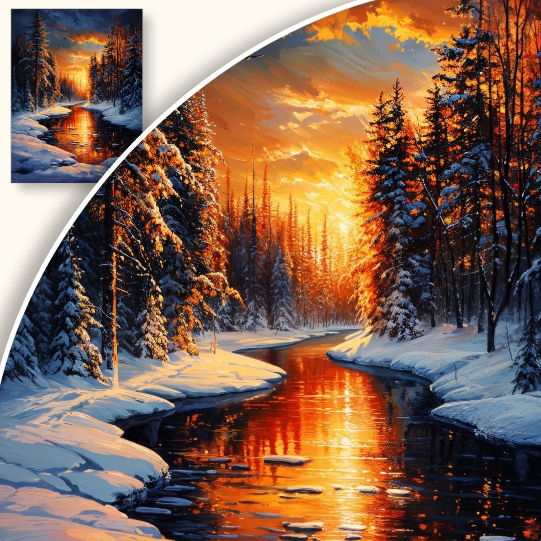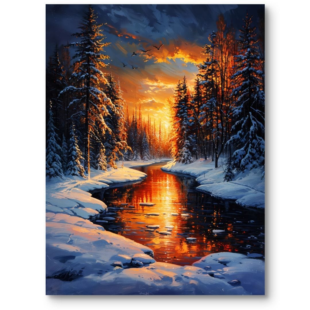Obraz na płótnie ukazuje urzekający zimowy pejzaż, gdzie czysty biały śnieg lśni w promieniach ciepłego, złocistego światła zachodzącego słońca. Centralnym elementem kompozycji jest meandrująca rzeka, otulona gęstym, iglastym lasem zasypanym śniegiem. Na tle nieba migrujące ptaki wprowadzają do sceny subtelną nutę ruchu i życia. To pełne harmonii i wdzięku dzieło wycisza, zachęcając do chwili kontemplacji nad pięknem natury zimą.