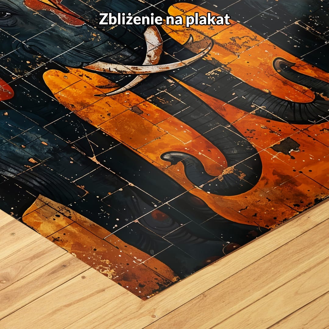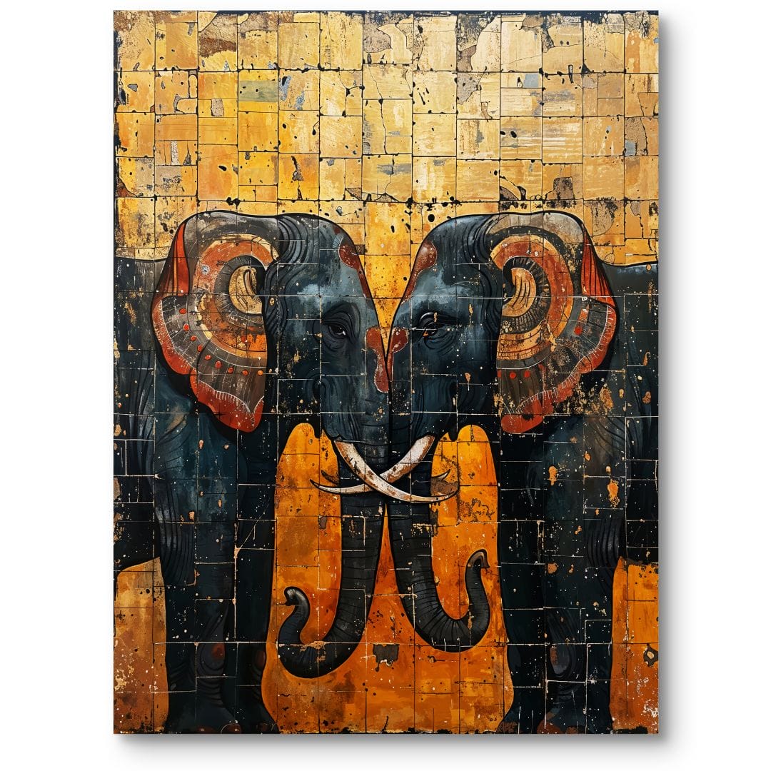 Ten wyjątkowy obraz na płótnie ukazuje parę majestatycznych słoni, osadzonych w niezwykle oryginalnej, abstrakcyjnej scenerii. Słonie – pełne gracji i dostojeństwa – zostały ukazane w żywych, intensywnych kolorach, wśród których królują złoto, czerń i pomarańcz. Motyw słonia od wieków kojarzony jest z siłą, mądrością i szlachetnością, czyniąc dzieło nie tylko dekoracją, ale także wyrazem głębokiej symboliki.