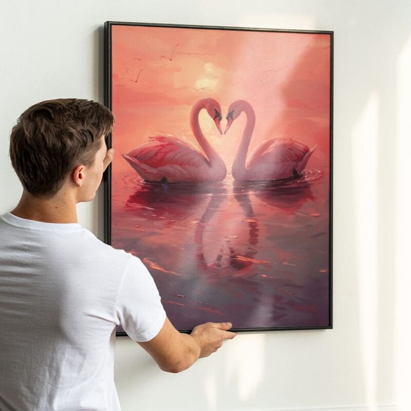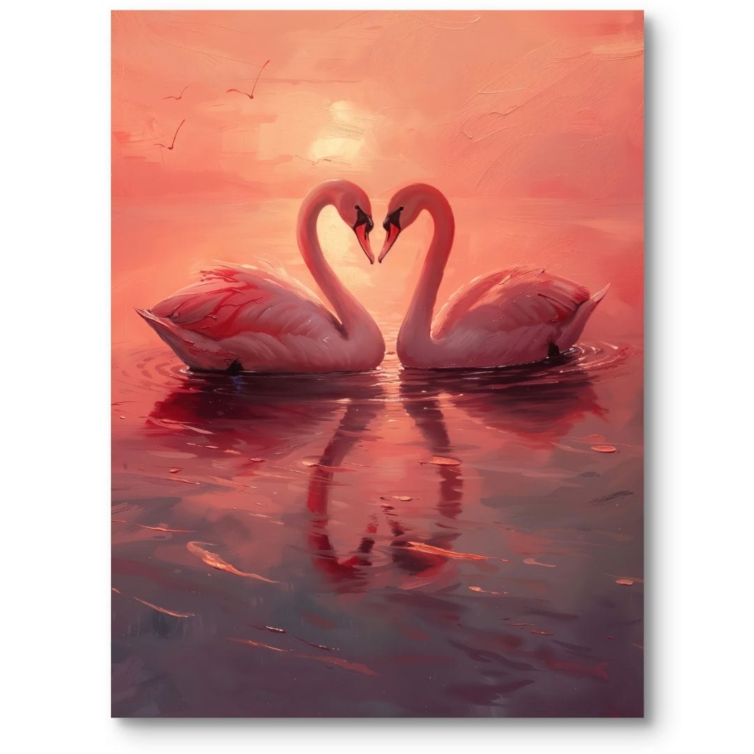 Prezentowany obraz na płótnie ukazuje parę eleganckich łabędzi płynących po spokojnej tafli jeziora w blasku zachodzącego słońca. Zmysłowe ułożenie ptaków, których szyje delikatnie splatają się w kształt serca, nadaje całej scenie wyrazistego, romantycznego charakteru. Zjawiskowe barwy zachodu – subtelne różowe, pomarańczowe i fioletowe tony – podkreślają ciepło i głębokie uczucia płynące z tej kompozycji, tworząc wyjątkową atmosferę harmonii oraz bliskości.