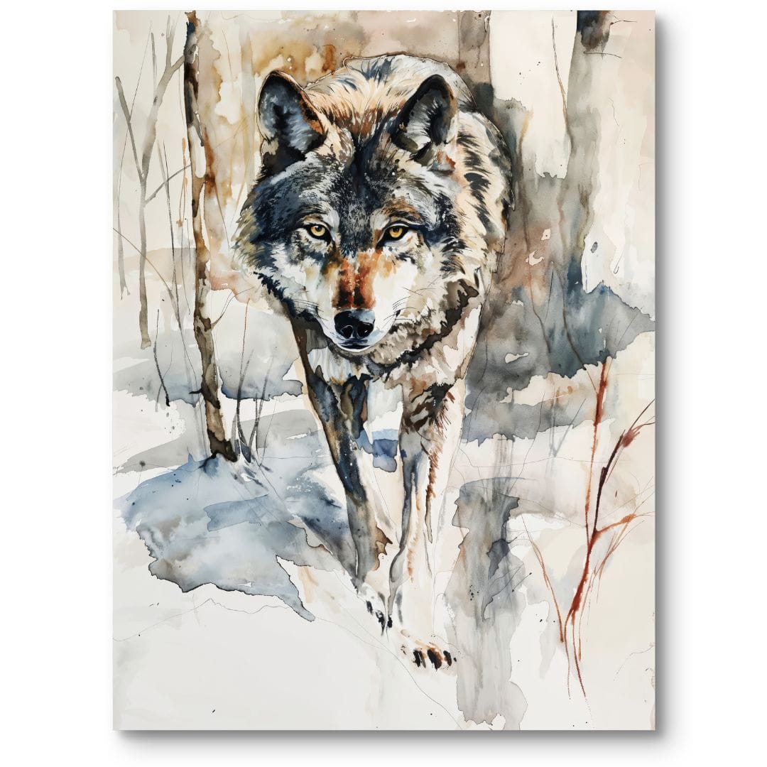 Dzieło zostało wykonane techniką akwareli, która pięknie oddaje subtelność i przejrzystość zimowej scenerii. Precyzyjne pociągnięcia pędzla oraz delikatne przenikanie się barw podkreślają naturalność przedstawienia. Dzięki tej technice uzyskano łagodne przejścia kolorystyczne i wyraźnie odwzorowano fakturę futra wilka oraz lśniący śnieg pod jego łapami.