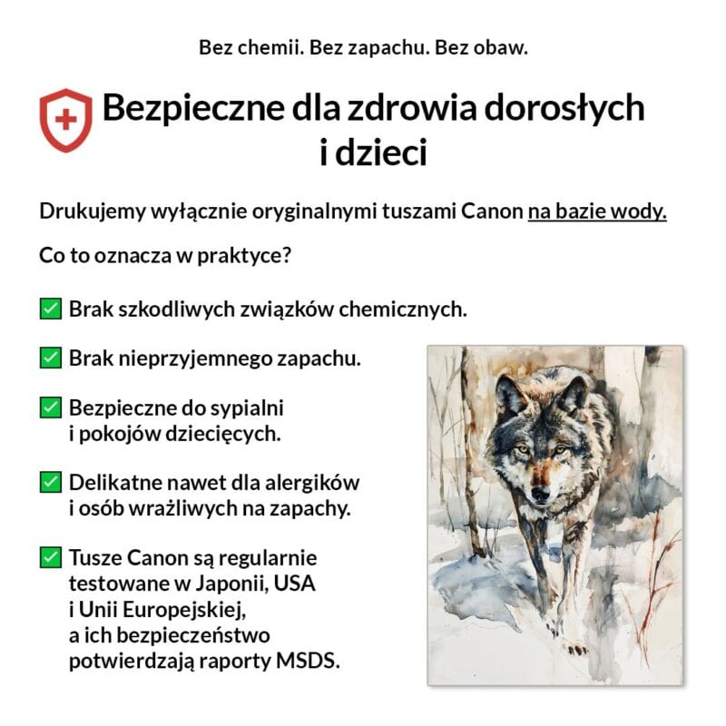 Tak, absolutnie! Drukujemy wyłącznie certyfikowanymi, bezwonnymi tuszami pigmentowymi Canon Lucia Pro na bazie wody. Są one w pełni bezpieczne dla zdrowia, nie zawierają rozpuszczalników i mogą być bez obaw stosowane w sypialniach i pokojach dziecięcych.