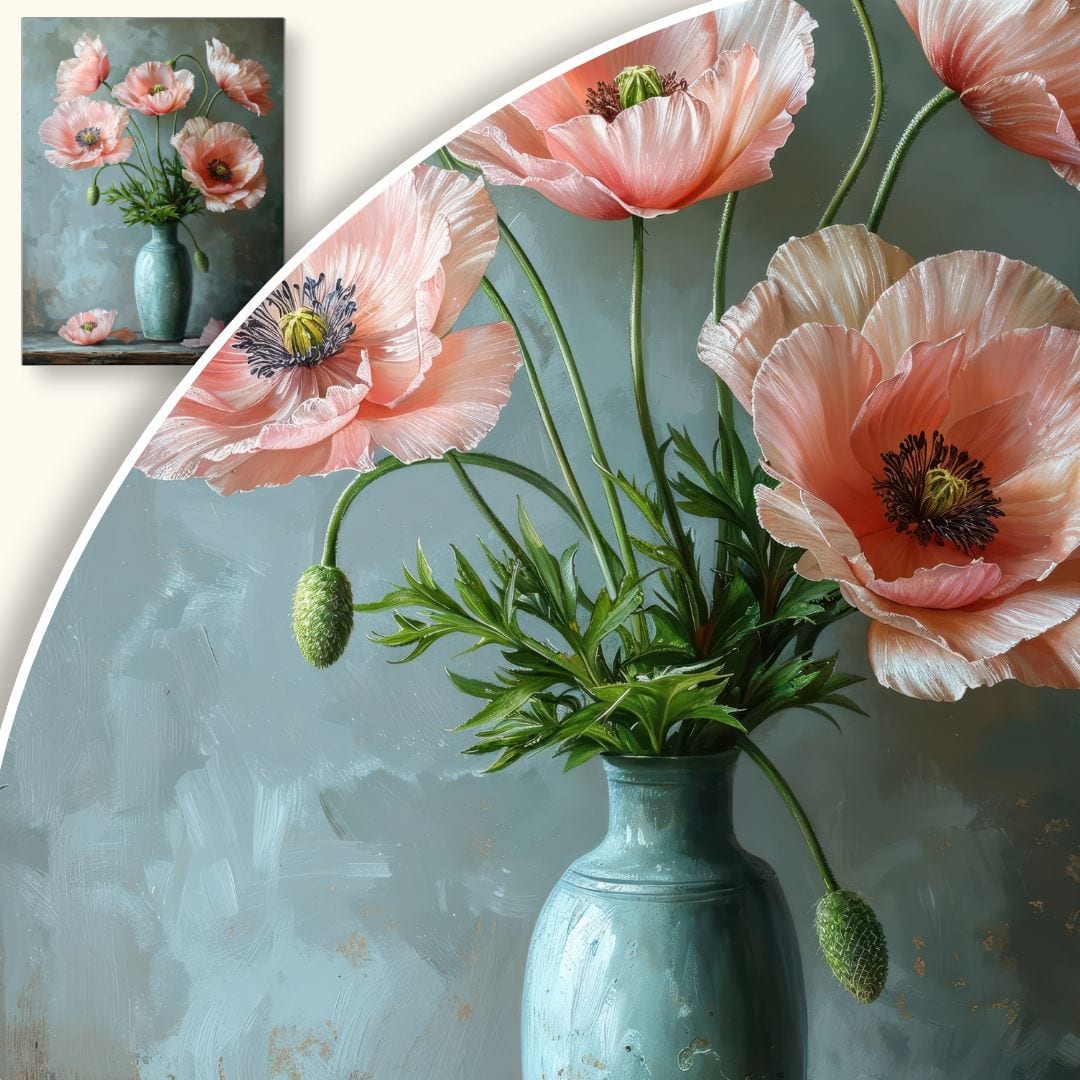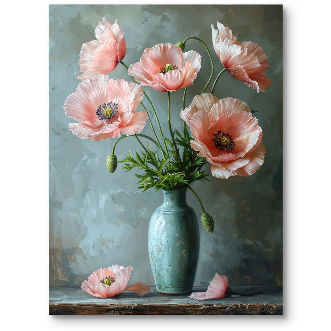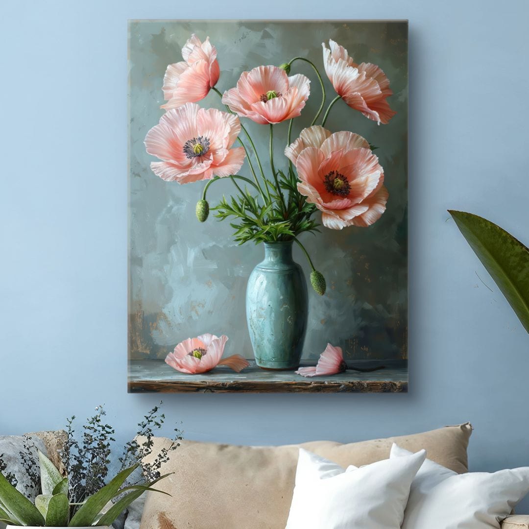 Centralnie umieszczony wazon i harmonijny układ kwiatów tworzą doskonale wyważoną całość. Subtelna gra światła wydobywa miękkość płatków oraz subtelny blask ceramiki, zestawiając wyraziste różowe maki z delikatnym, pastelowym tłem. Paleta kolorystyczna, oparta na różu, zieleni i odcieniach szarości, buduje atmosferę spokoju, nadając wnętrzu niepowtarzalną aurę świeżości i elegancji.