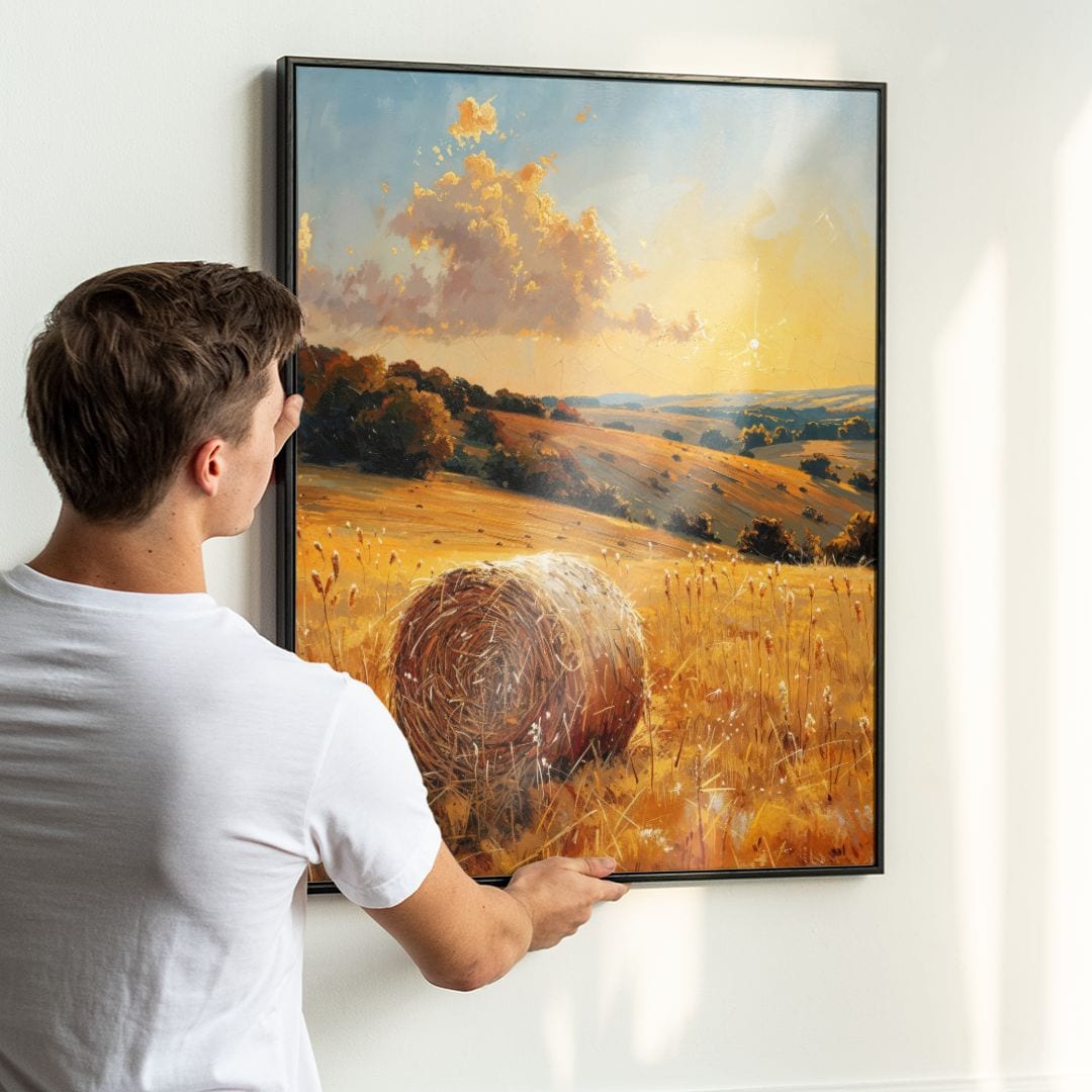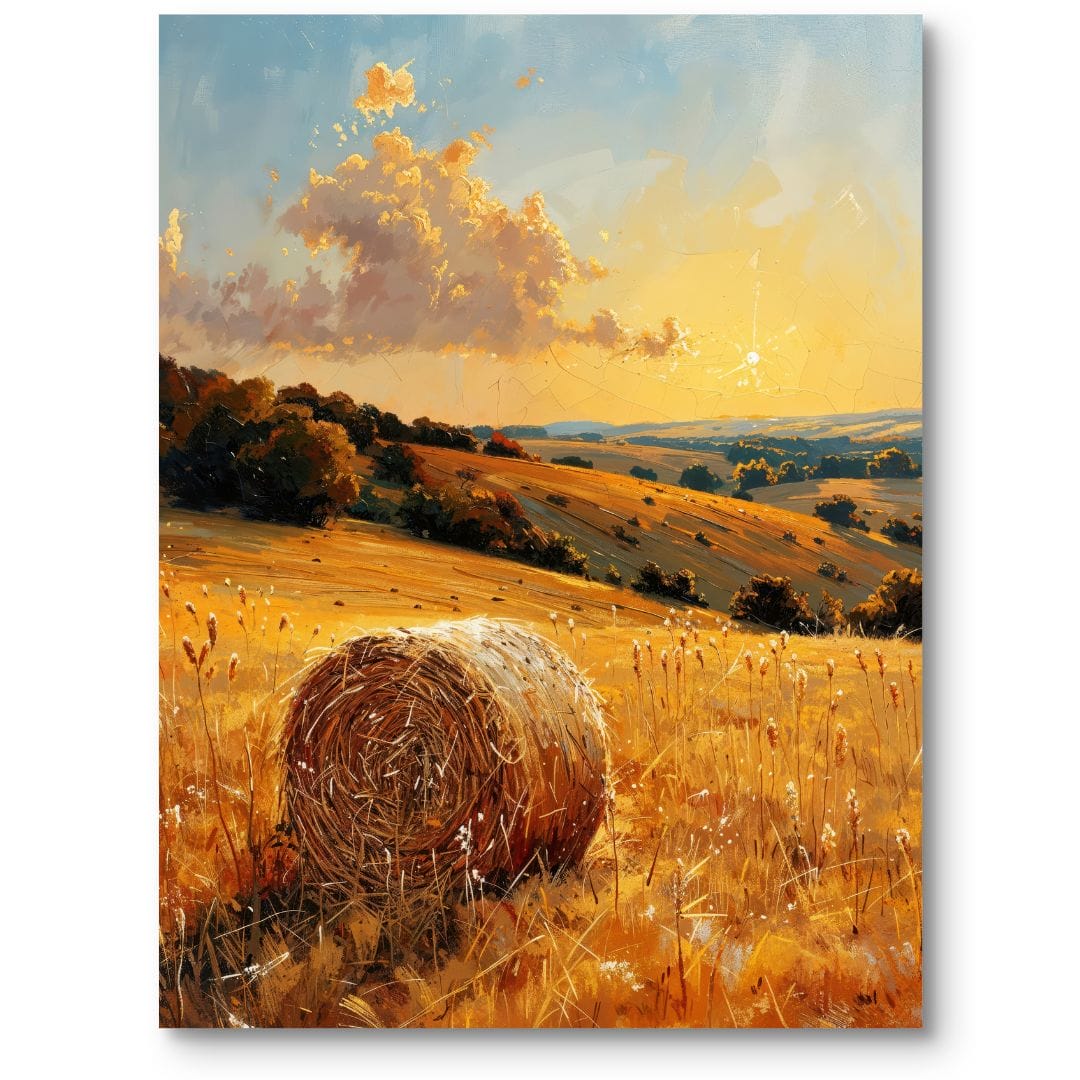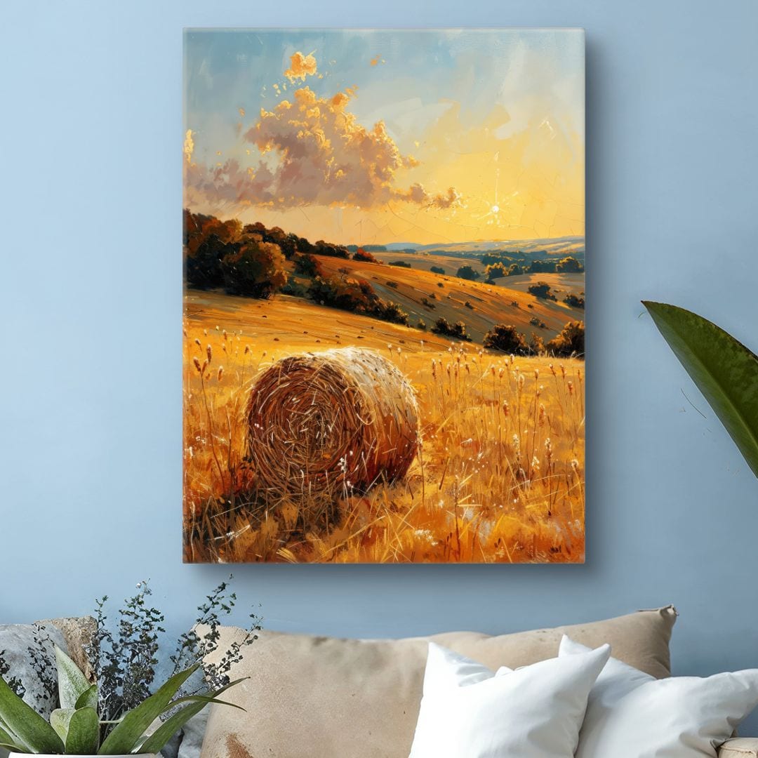 Prezentowany obraz na płótnie przedstawia urzekający wiejski krajobraz, gdzie złociste pola toną w blasku zachodzącego słońca. Na pierwszym planie wyeksponowany jest snop siana, który dodaje kompozycji naturalności oraz głębi. Scena zachwyca prostotą i autentyzmem życia na wsi, podkreślając urodę natury, rolniczego trudu i harmonii z otoczeniem.