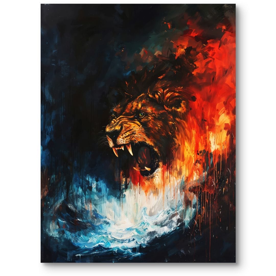 Obraz na płótnie ukazuje majestatycznego, ryczącego lwa, otoczonego ekspresyjnymi żywiołami ognia i wody. Symbolizuje on niezłomną siłę, odwagę oraz nieustępliwy charakter, co zostało podkreślone dynamiczną kompozycją oraz dbałością o detale. Kontrastujące żywioły nadają dziełu niezwykłą energię, tworząc głęboko emocjonalny klimat.