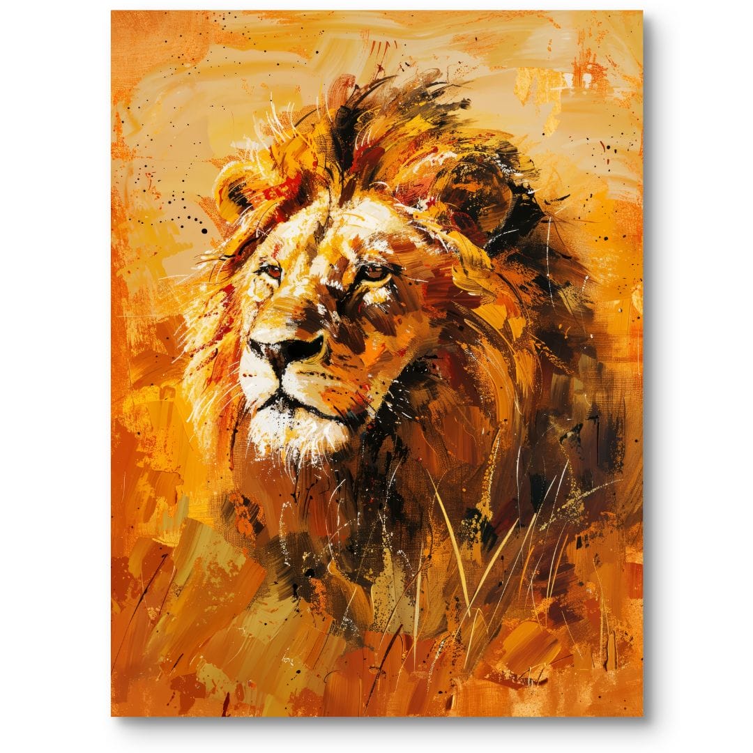 Ten obraz przedstawia niepowtarzalny portret lwa, ukazując jego królewskie oblicze w niezwykle dynamicznej i energetycznej formie. Zachwyca połączeniem ekspresji z dumą i majestatem, które w pełni oddają charakter tego władcy dżungli.