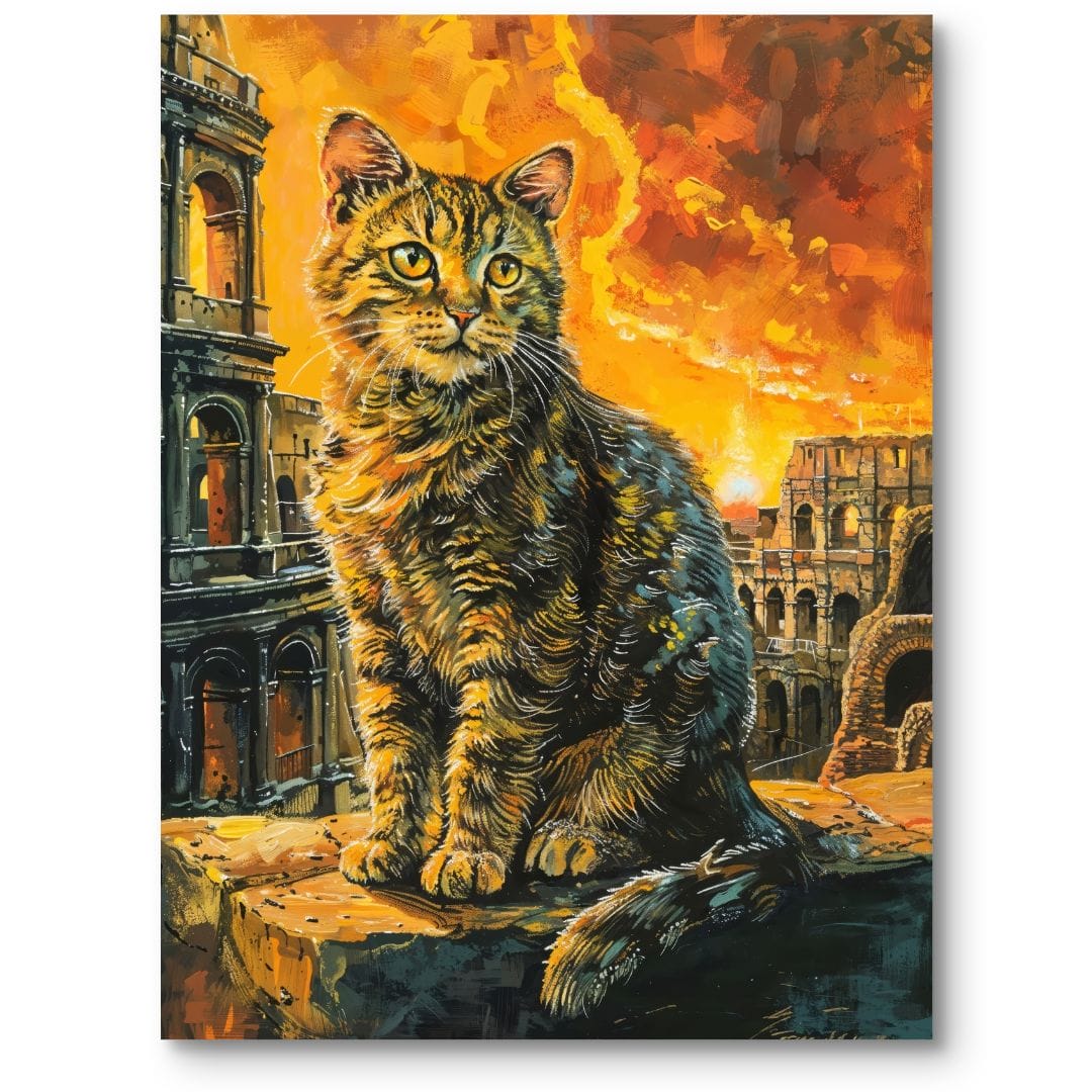 Ten wyjątkowy obraz przedstawia starannie namalowanego kota, który dostojnie przesiaduje na tle majestatycznych ruin Koloseum w Rzymie. Żywa, pomarańczowo-żółta paleta barw nawiązuje do magicznego zachodu słońca, otaczając scenę ciepłym blaskiem i wprowadzając nostalgiczny klimat. Historyczne tło Koloseum dopełnia całości, łącząc motywy natury z ponadczasową architekturą.