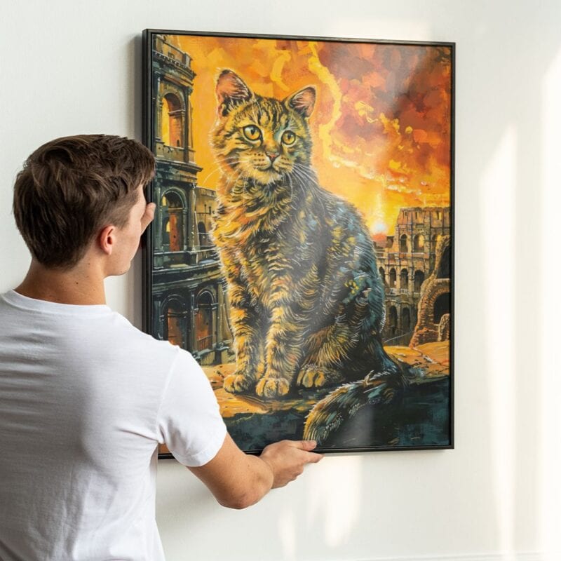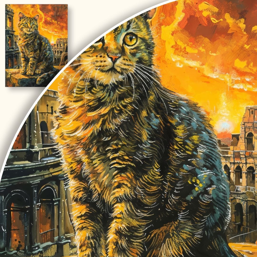 Koloseum, tło tej kompozycji, jest jednym z najsłynniejszych symboli Rzymu i całej europejskiej kultury. Połączenie majestatycznej ruiny z sylwetką kota — zwierzęcia cenionego w sztuce za swoją tajemniczość i wdzięk — tworzy fascynującą narrację. Koty od wieków obecne są w dziełach sztuki: od faraońskiego Egiptu po współczesność, symbolizując domowe ciepło i niezależność. W tym kontekście obraz nawiązuje do tradycji, w której harmonia człowieka, przyrody i kultury odgrywa kluczową rolę.