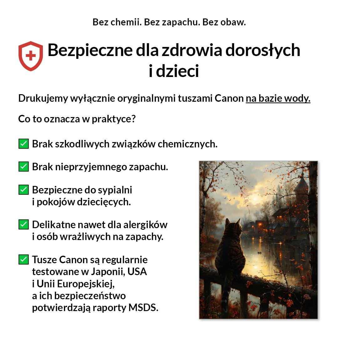My drukujemy wyłącznie na pigmentowych tuszach Canon LUCIA PRO, bezpiecznych, bezzapachowych i certyfikowanych.