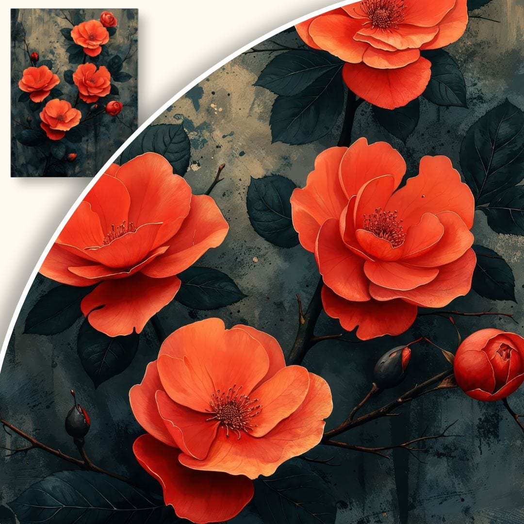 Centralnie umieszczone róże przyciągają uwagę i stanowią osnowę całego obrazu. Delikatnie rozproszone światło podkreśla ich wyjątkowe piękno, wydobywając głębię i naturalne kontury. Połączenie intensywnych i stonowanych barw nadaje dziełu wyjątkowego charakteru – jest zarówno ciepłe, jak i kojące.