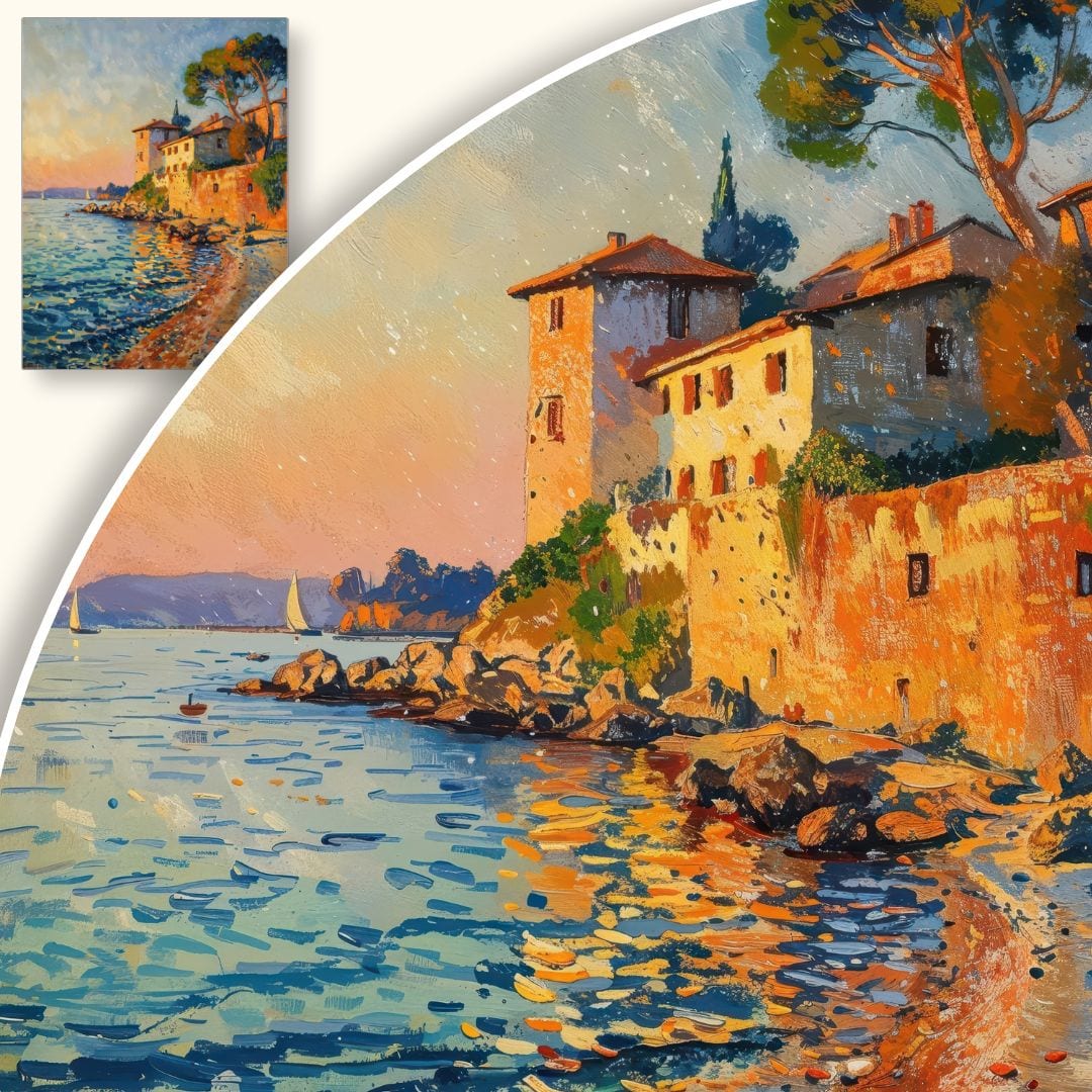 Obraz na płótnie prezentuje malowniczy krajobraz nadmorskiej miejscowości, w której urzekające wille z kamienia skąpane są w ciepłych promieniach zachodzącego słońca. Na dalszym planie spokojne, błękitne morze odbija rozświetlone niebo, tworząc niezwykle harmonijną i sielską atmosferę. To dzieło mistrzowsko ilustruje piękno architektury połączonej z naturą oraz celebruje idylliczny moment wieczornego relaksu.