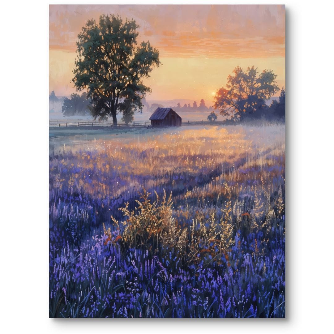 Ten obraz na płótnie ukazuje zachwycający krajobraz wschodu słońca nad malowniczym, błękitno-fioletowym polem lawendy. W centrum kompozycji wyróżnia się samotny, drewniany domek otoczony bujną roślinnością i majestatycznymi drzewami. Całość spowija delikatna mgła, a ciepłe, pomarańczowe promienie wschodzącego słońca dodają scenie magicznego, nostalgicznego blasku.