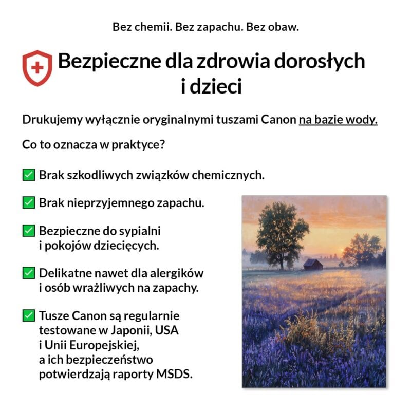 Tak, absolutnie! Drukujemy wyłącznie certyfikowanymi, bezwonnymi tuszami pigmentowymi Canon Lucia Pro na bazie wody. Są one w pełni bezpieczne dla zdrowia, nie zawierają rozpuszczalników i mogą być bez obaw stosowane w sypialniach i pokojach dziecięcych.