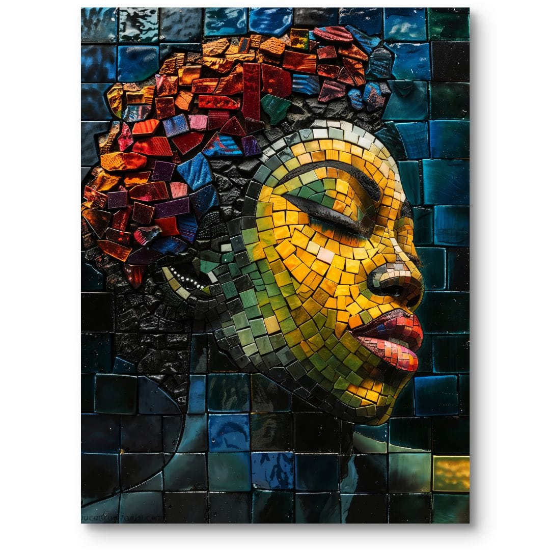 Obraz zachwyca stylem mozaikowym, który łączy realizm detali twarzy z geometryczną układanką kolorowych elementów. Mozaika polega na tworzeniu całości z wielu barwnych kawałków szkła, ceramiki lub kamieni, co daje efekt głębi oraz subtelnej gry światła i cienia.
