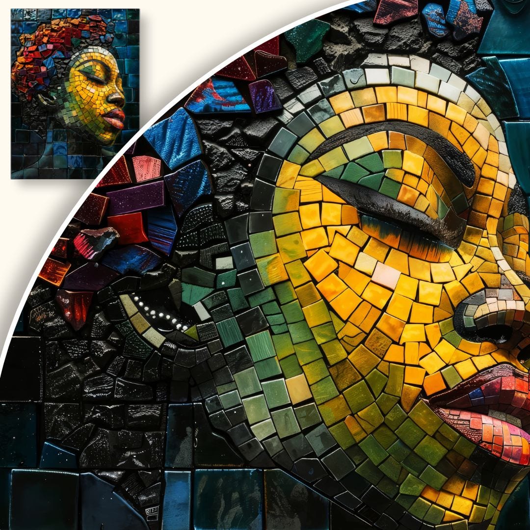 Technika mozaiki, wykorzystywana w tym obrazie, sięga starożytności i była mistrzowsko stosowana choćby w Pompejach czy bizantyjskich świątyniach. Dziś jej nowoczesne interpretacje, tak jak tutaj, dają niezwykłą swobodę artystyczną i oryginalny efekt wizualny – nawiązując do dzieł takich artystów jak Antoni Gaudí, czy współczesna artystka Emma Biggs, znana z ekspresyjnych, barwnych portretów.