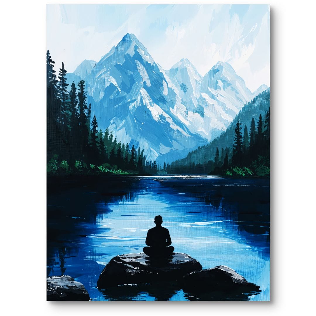 Obraz na płótnie ukazuje malowniczy, górski krajobraz z postacią pogrążoną w medytacji nad brzegiem spokojnego jeziora. Kompozycję budują majestatyczne, ośnieżone szczyty odbijające się w krystalicznie czystej tafli wody oraz sylwetka człowieka medytującego na kamieniu, otoczona soczystą zielenią leśnych drzew. Całość tworzy nastrojową przestrzeń, pełną naturalnego piękna i harmonii.