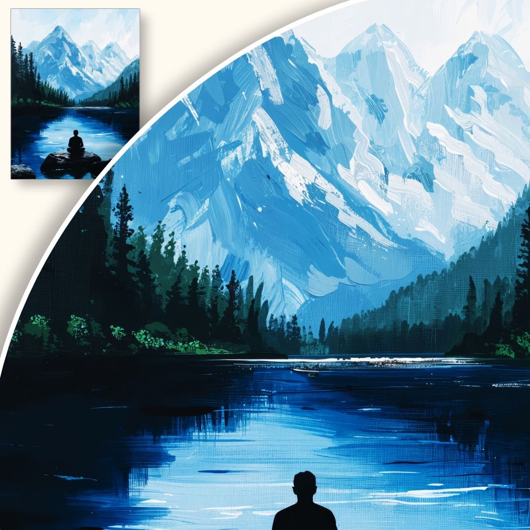 Zrównoważona kompozycja skupia uwagę widza na medytującej postaci umieszczonej w centrum. Chłodne błękity gór i jeziora przeplatają się z głęboką zielenią lasu, potęgując wrażenie spokoju i wyciszenia. Miękkie światło i subtelne refleksy na wodzie nadają obrazowi sugestywnej głębi i sprawiają, że kompozycja staje się jeszcze bardziej realistyczna.