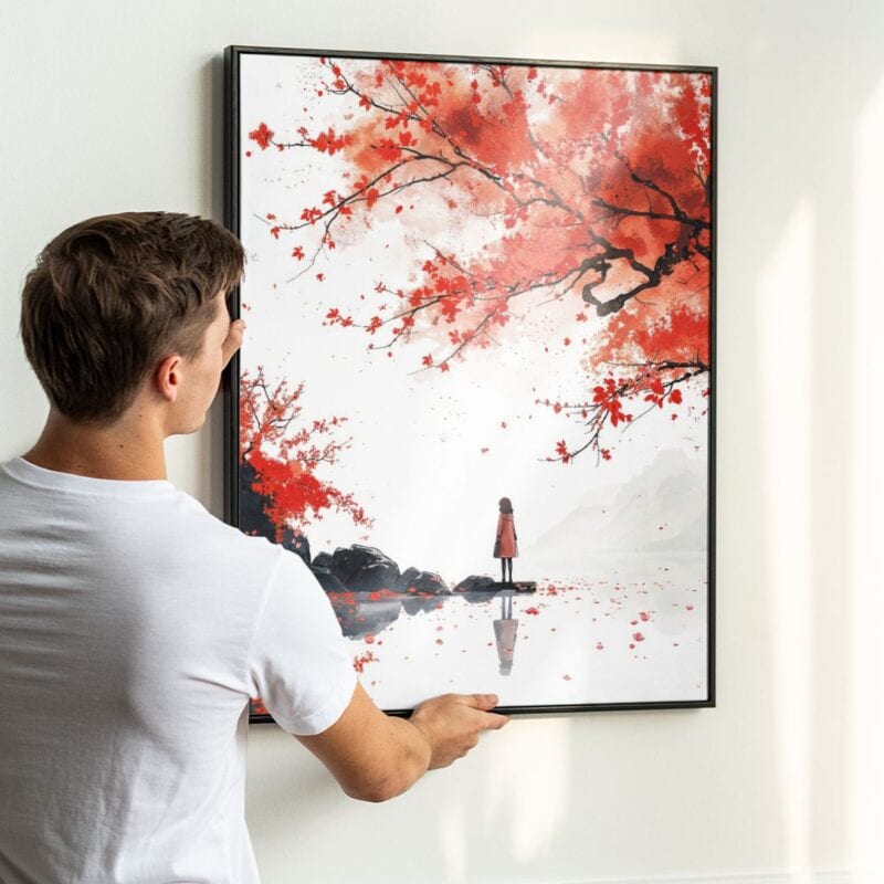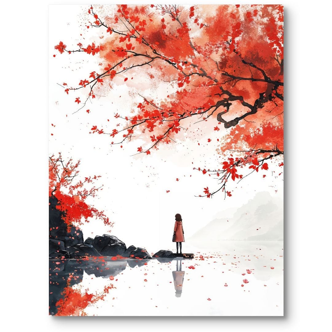 Plakat na ścianę ukazuje romantyczny, nostalgiczny krajobraz, w którym pierwsze skrzypce grają intensywnie czerwone liście drzew. W centrum kompozycji znajduje się zamyślona dziewczynka stojąca na kamieniu pośród spokojnej wody. Całość utrzymana jest w atmosferze zadumy i refleksji, a subtelna gra barw oraz delikatność detali podkreślają ciepły, sentymentalny nastrój, który przyciąga uwagę i pozwala się zatrzymać w chwili.