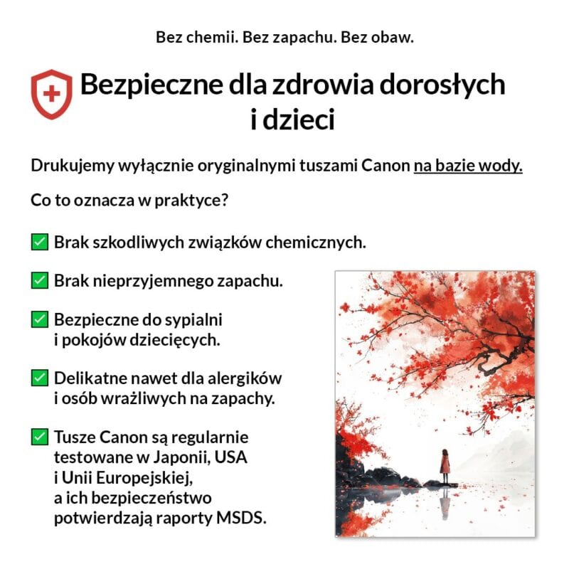 Tak, absolutnie! Drukujemy wyłącznie certyfikowanymi, bezwonnymi tuszami pigmentowymi Canon Lucia Pro na bazie wody. Są one w pełni bezpieczne dla zdrowia, nie zawierają rozpuszczalników i mogą być bez obaw stosowane w sypialniach i pokojach dziecięcych.
