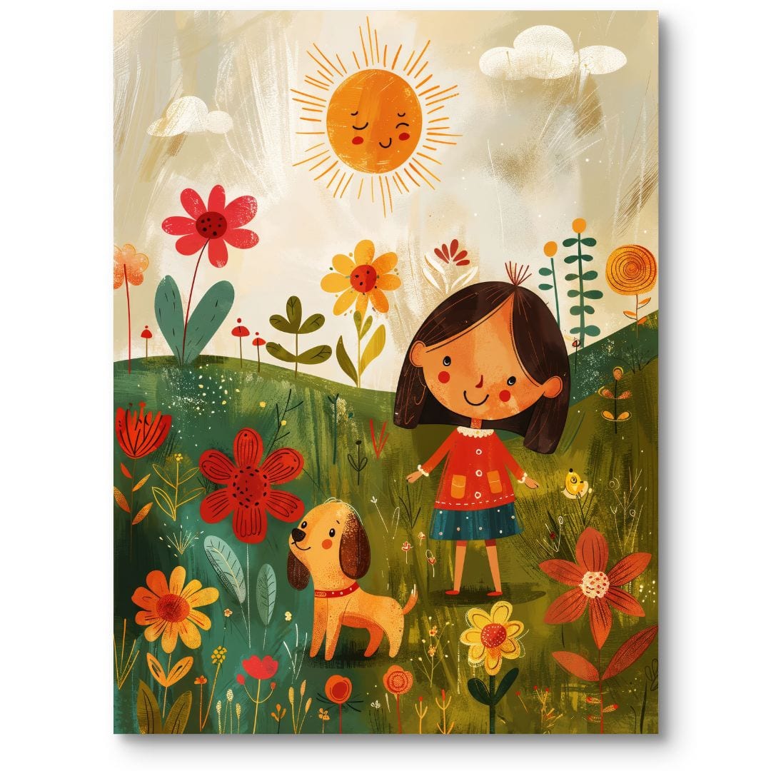 - Plakat dziecięcy z dziewczynką i wiernym psem w otoczeniu kwiatów.