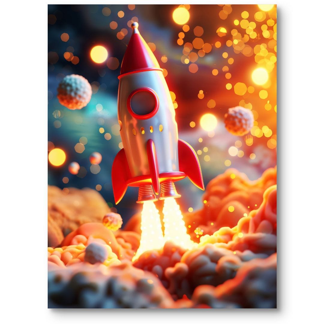 Plakat ukazuje niezwykle sugestywną scenę startu rakiety, otoczonej przez barwne planety i roziskrzone gwiazdy. Motyw eksploracji kosmosu, pełen magii i nieskończonych możliwości, rozbudza wyobraźnię oraz zachęca do marzeń o podbojach nowych światów. To idealny akcent dla miłośników astronomii i tych, którzy cenią tematy futurystyczne.