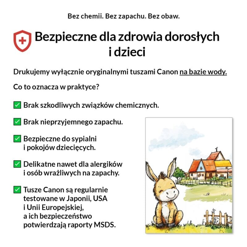 Tak, absolutnie! Drukujemy wyłącznie certyfikowanymi, bezwonnymi tuszami pigmentowymi Canon Lucia Pro na bazie wody. Są one w pełni bezpieczne dla zdrowia, nie zawierają rozpuszczalników i mogą być bez obaw stosowane w sypialniach i pokojach dziecięcych.