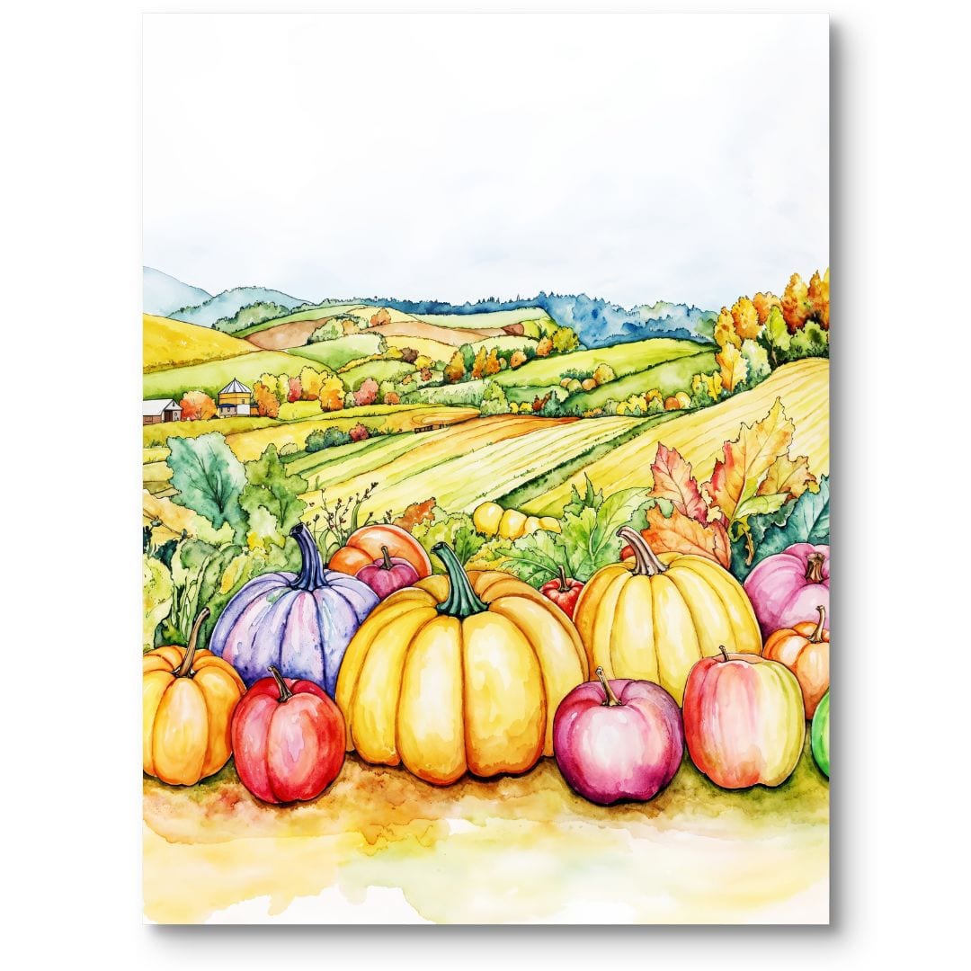 Starannie zrównoważona kompozycja przyciąga spojrzenie ku dyniom w centrum, których soczyste barwy dodają życia i optymizmu. Subtelnie zarysowany krajobraz w tle podkreśla głębię i rytm całego plakatu, budując poczucie spokoju i naturalnej harmonii.