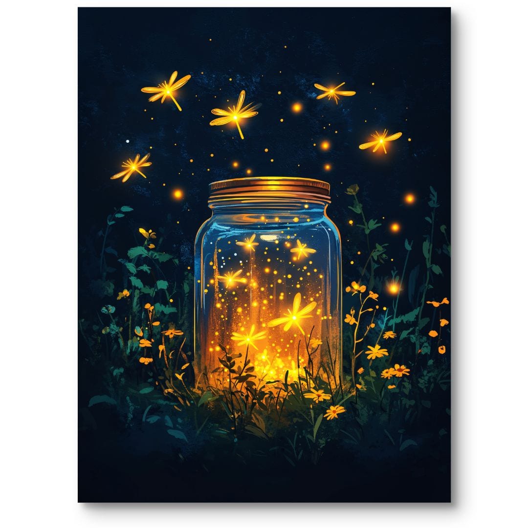 Ten plakat prezentuje słoik wypełniony intensywnie świecącymi świetlikami, unoszącymi się nad bujną, zieloną roślinnością. Całość otulona jest nastrojowym półmrokiem, dzięki czemu złociste świetliki fantastycznie kontrastują z głębokim, ciemnym tłem i soczystą zielenią otoczenia. Ilustracja tworzy magiczną i nieco surrealistyczną atmosferę, przenosząc widza w świat wieczornego spokoju i natury pełnej cudów.