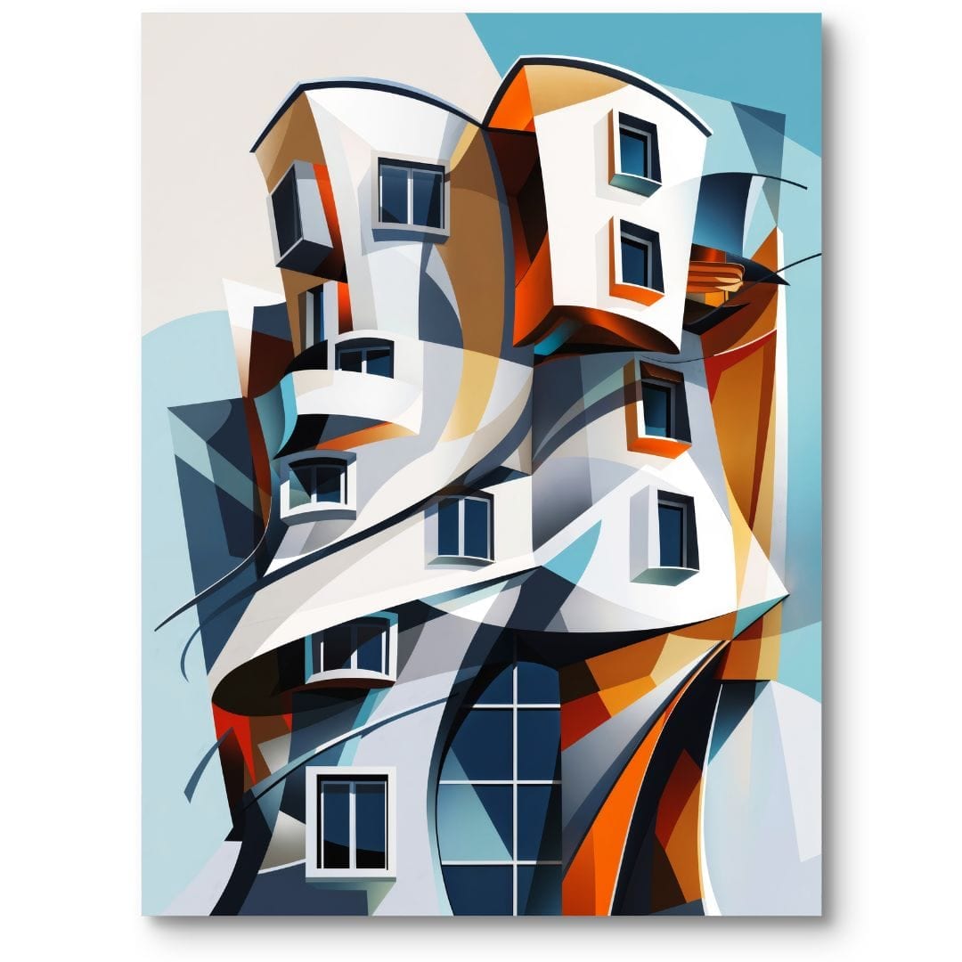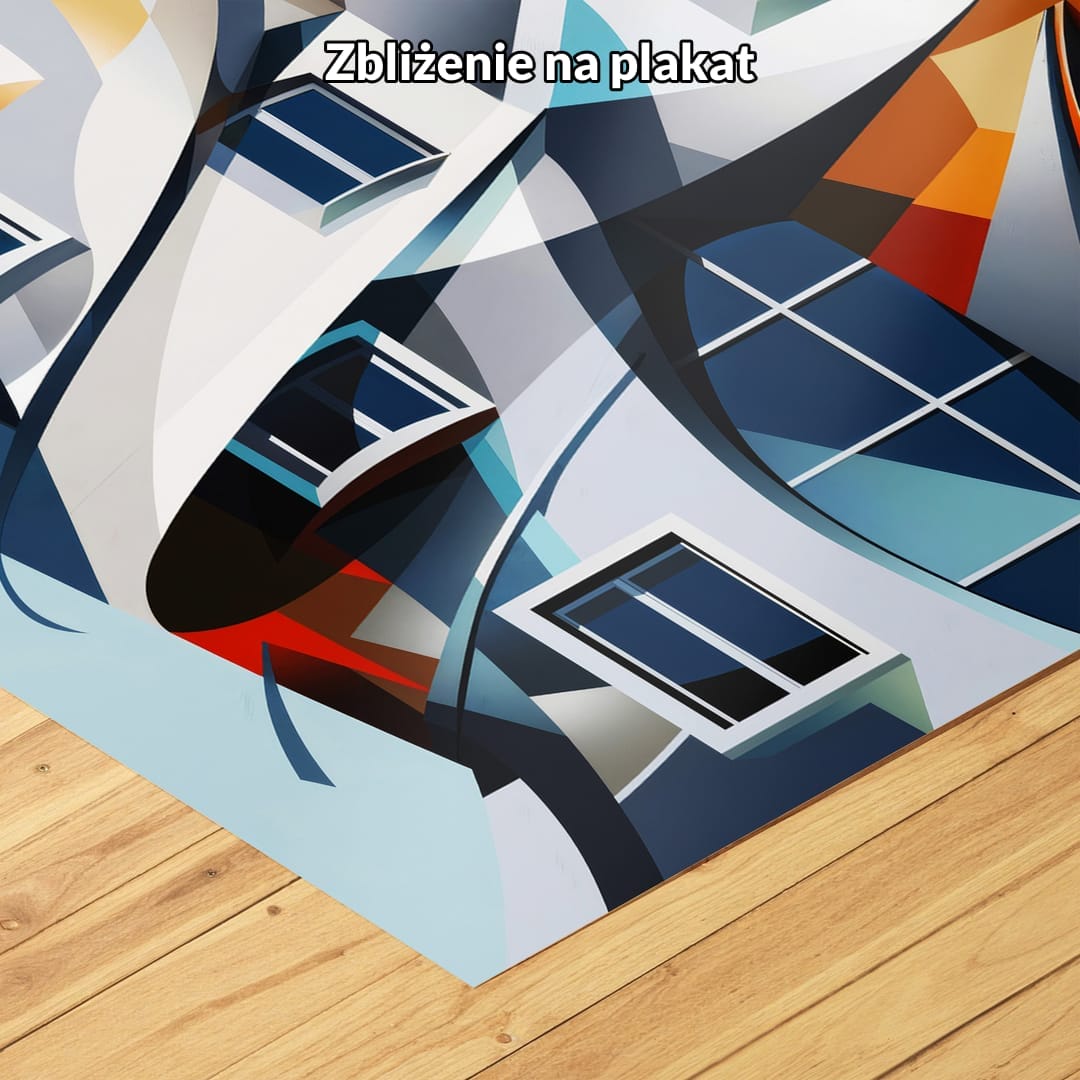 Ten wyjątkowy plakat prezentuje abstrakcyjny budynek o dynamicznych, zdeformowanych formach, inspirowanych estetyką kubizmu. Złożone, geometryczne figury i intensywne kolory przenoszą odbiorcę w świat architektonicznej fantazji, gdzie konwencjonalne kształty ustępują miejsca śmiałej, artystycznej wizji.