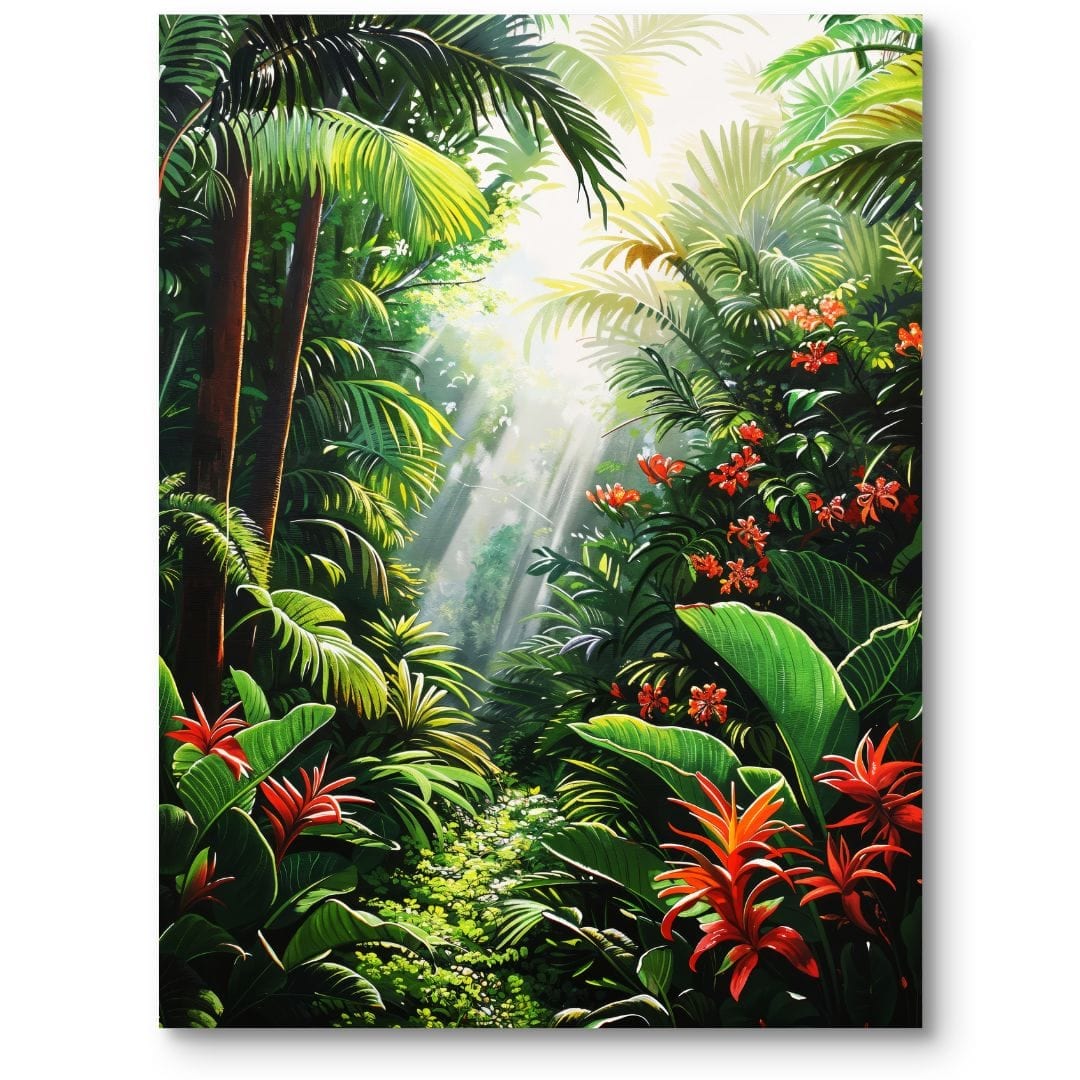Tropikalne motywy od lat inspirują artystów na całym świecie – już w XIX wieku artyści tacy jak Henri Rousseau zachwycali się dziką roślinnością, tworząc słynne obrazy pełne egzotyki i bujnej przyrody. Współczesna sztuka cyfrowa pozwala oddać te same wrażenia w zupełnie nowej odsłonie, zachowując precyzję i intensywność kolorów, a jednocześnie podkreślając fascynację naturalnym pięknem i różnorodnością tropików.