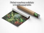 Ten wyjątkowy plakat przeniesie Cię w sam środek gęstej, tropikalnej dżungli pełnej bujnej zieleni i egzotycznych roślin. W centrum kompozycji rozpościerają się soczyście zielone liście, przeplatane wyrazistymi, czerwonymi kwiatami, co nadaje całości dynamiczny charakter i wspaniały kontrast barw.