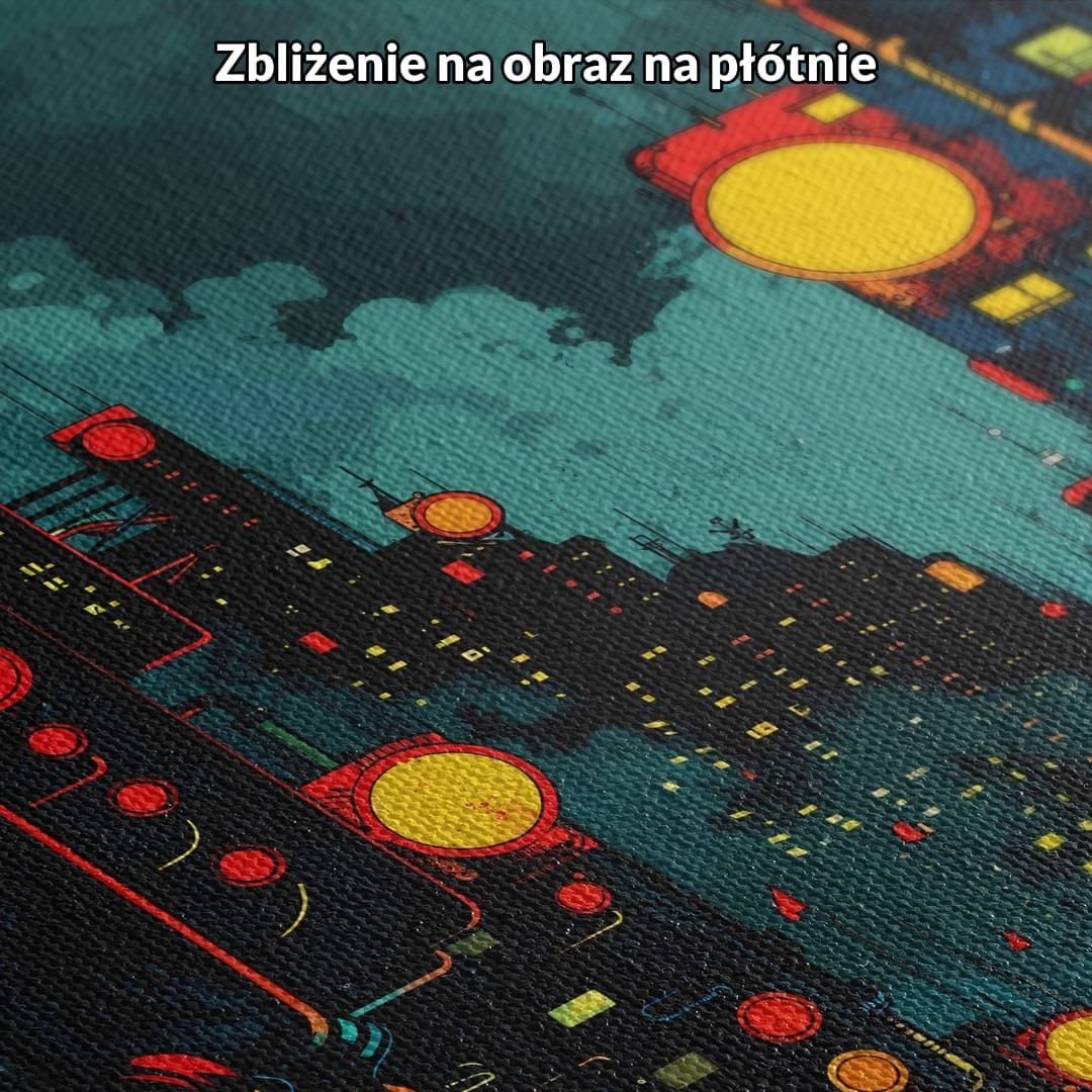 Środek kompozycji stanowi dynamiczna gra perspektyw i pionowych linii budynków, a dominujące zimne zielenie łączą się z kontrastującymi, ciepłymi akcentami światła w czerwieni i żółci. Taki dobór barw potęguje wrażenie dramatyzmu i podkreśla tajemniczy, nieco mroczny charakter sceny.