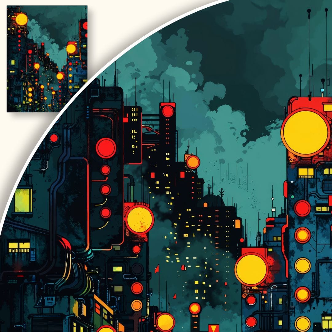 Ten niezwykły plakat przedstawia futurystyczne miasto nocą, inspirowane stylistyką neo-noir oraz światem science fiction. Strzeliste wieżowce rozświetlają okrągłe, intensywne światła w odcieniach czerwieni i żółci, budując atmosferę tajemnicy, pełną energii, ale i nutki niepokoju. Całość emanuje wyrazistym klimatem rodem z cyberpunkowych wizji przyszłości.