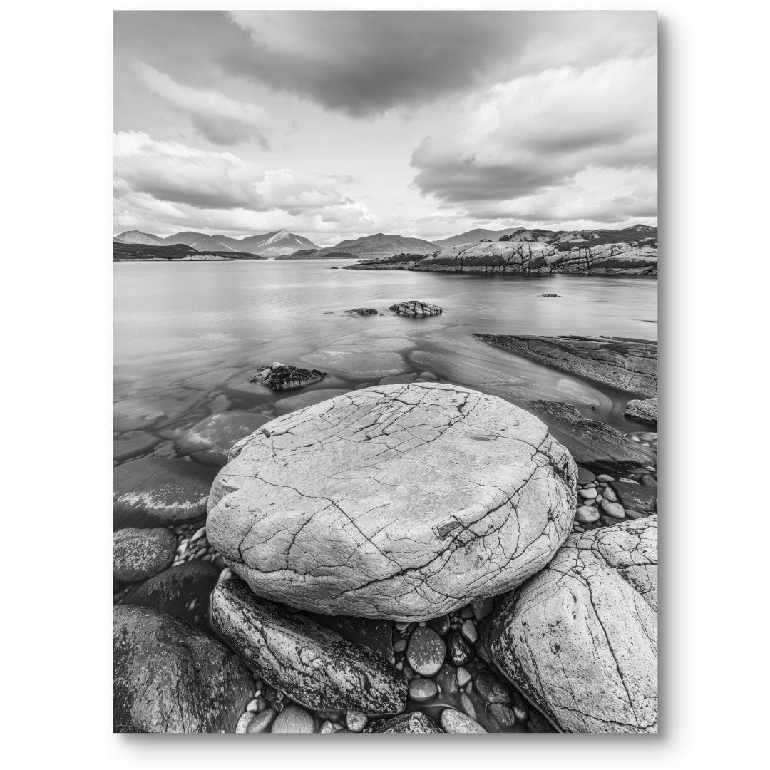 Ten plakat oddaje niezwykły, wyciszający widok skalistego brzegu jeziora, gdzie na pierwszym planie dominuje potężna skała. W tle rozciągają się spokojne fale jeziora, u stóp malowniczych gór, tworząc scenerię pełną majestatu i nostalgii. Czarno-biała kolorystyka podkreśla naturalną tajemniczość oraz ponadczasowy spokój tego miejsca.