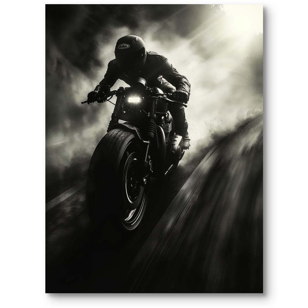 Centralna kompozycja z motocyklistą na pierwszym planie przyciąga wzrok już od pierwszego spojrzenia. Dominuje minimalistyczna paleta czerni i bieli, która wprowadza nastrój tajemnicy oraz głębię obrazu. Skoncentrowane światło wyeksponowane na kierowcy i motocyklu akcentuje najważniejsze elementy tej intrygującej sceny.