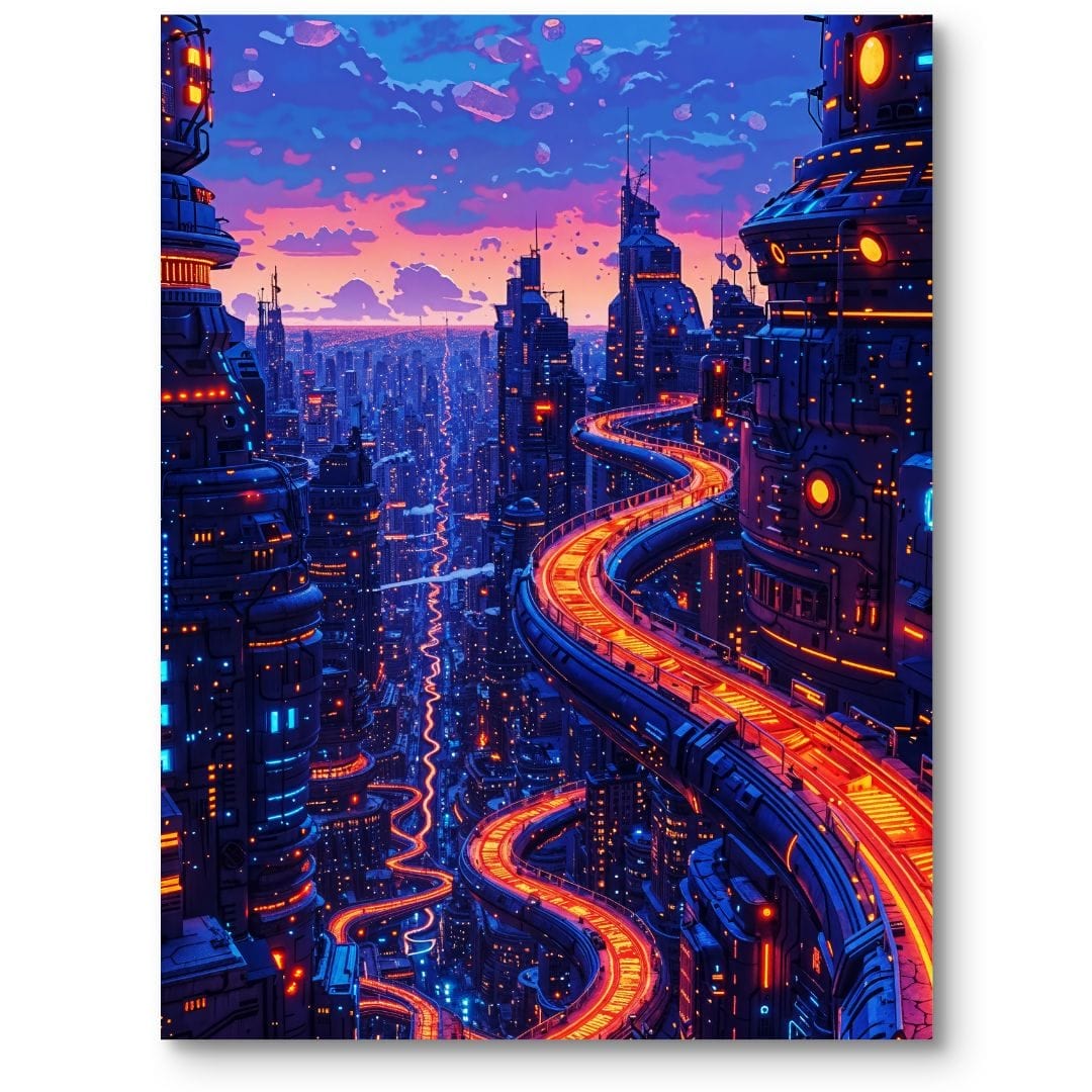 Plakat przenosi widza w serce futurystycznej metropolii nocą, tętniącej życiem pod niezliczonymi neonami. Dynamiczne linie, imponujące wieżowce i splecione drogi wpisują się w estetykę miasta przyszłości, gdzie gra świateł i cieni tworzy niezwykłą, cyberpunkową atmosferę. Intensywne kolory i pulsujące neony zapraszają do świata, w którym technologia wyznacza nowe kierunki.
