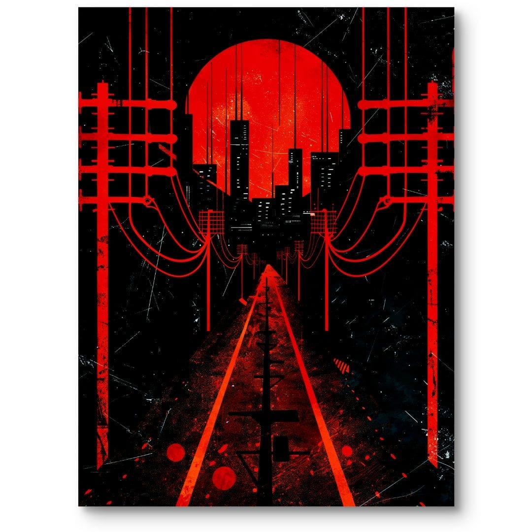 Ten wyjątkowy plakat ukazuje mroczną wizję miejskiego pejzażu, na którego tle wyraźnie dominuje intensywnie czerwony księżyc. Kompozycję budują masywne wieżowce oplecione plątaniną kabli i słupów przesyłowych, tworząc sugestywną scenę miejskiej dżungli pełnej kontrastów i tajemnic. Obraz ukazuje architekturę nowoczesnej metropolii, przypominając o jej przemysłowej, nieco niepokojącej stronie.